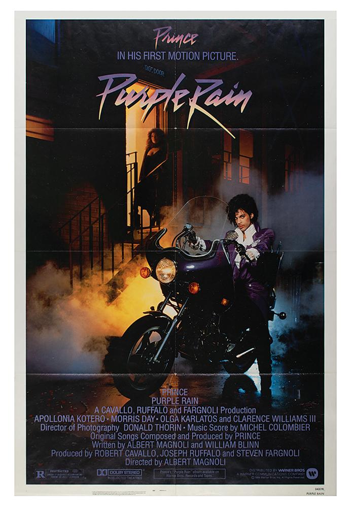 Original color 27 x 42 one sheet movie poster for the 1984 Warner Bros. film Purple Rain, which marked the acting debut of Prince and won the Academy Award for Best Original Song Score. The lower right corner is labeled as “840090, Purple Rain.” In fine condition, with folds as issued, and light handling wear.