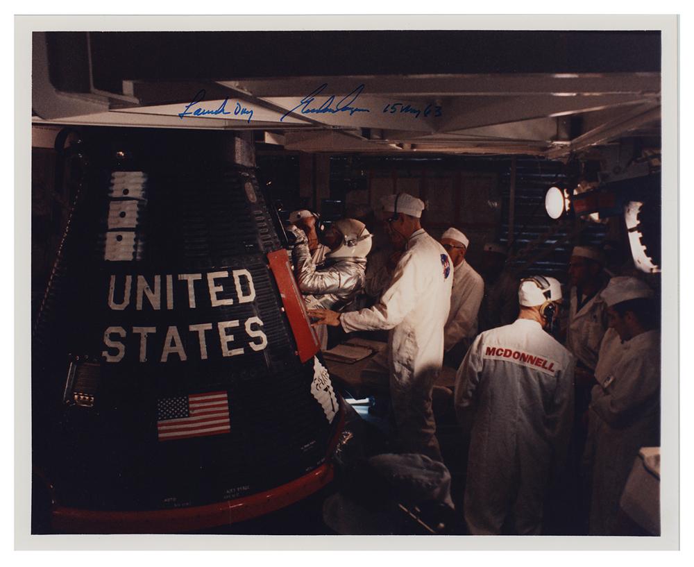 Color semi-glossy 10 x 8 photo of Cooper being helped inside his Faith 7 spacecraft prior to the Mercury-Atlas 9 mission, signed in blue felt tip, "Launch day, Gordon Cooper, 15 May 63." In fine condition.
