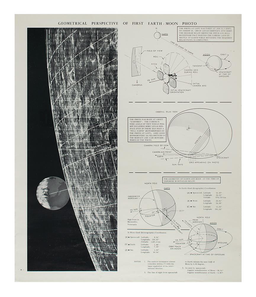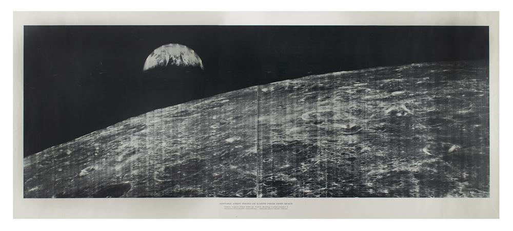 Two uncommon posters related to the Lunar Orbiter 1, the first American spacecraft to orbit the moon, 15 x 17.5 and 45.75 x 20.5, with the smaller poster featuring a “Geometrical Perspective of First Earth-Moon Photo,” with detailed mission information relative to the spacecraft, its camera, and the time of exposure; the larger poster contains a panoramic view of the Earth as viewed from high above the lunar terrain, with lower caption reading: “Historic First Photo of Earth from Deep Space / Taken August 23rd, 1966 by NASA—Boeing Lunar Orbiter I, Distance from Earth-232,000 mi.—Altitude above Moon-730 mi.” Both are rolled and in very good to fine condition, with scattered creasing, and slight edgewear to larger poster.
