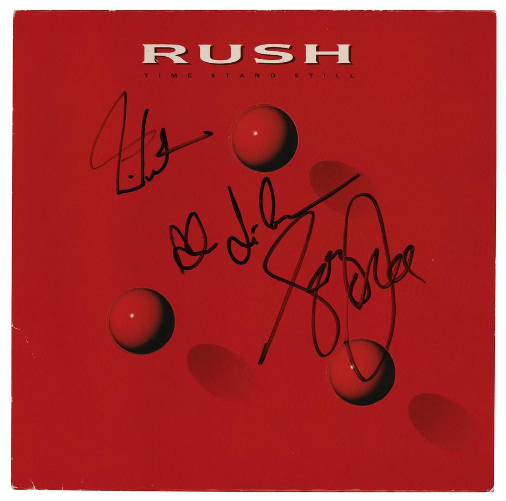 Vertigo Records 45 RPM single record for 'Time Stand Still / Force Ten' by Rush, signed on the front cover in black felt tip by Neil Peart, Geddy Lee, and Alex Lifeson. In fine condition. The record is included.
