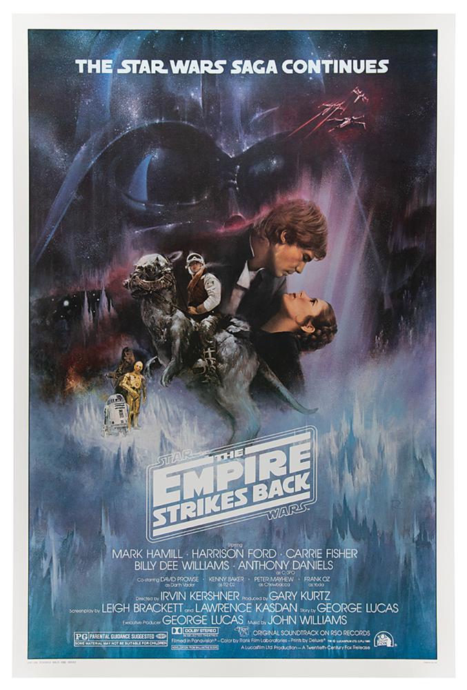 (20th Century Fox, 1980) Original color 27 x 41 studio version 'Style A' one sheet movie poster for the 1980 space opera The Empire Strikes Back, which features Roger Kastel's famous 'Gone With the Wind' style artwork of Hans Solo, Princess Leia, Luke Skywalker on a tauntaun, R2-D2, C-3PO, and Chewbacca below a large image of Darth Vader's upper helmet, with upper text reading: "The Star Wars Saga Continues." Lower portion features cast and crew credits and production details, with the bottom border of this 'studio' variant reading "Empire Strikes Back One Sheet, Printed In USA." Professionally restored to fine condition.