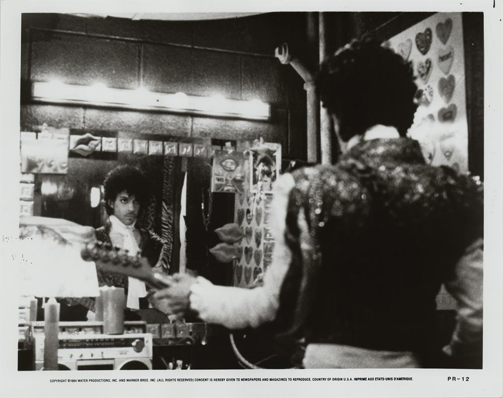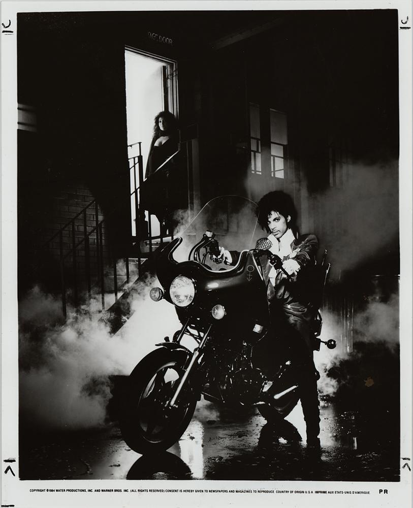 Group of ten original vintage glossy promo photos for Prince's iconic 1984 film Purple Rain, 8 x 10 and 10 x 8, including the famous 'movie poster' image of him on a motorcycle, action shots of him playing his guitar and singing on stage, seductive close-ups, and a great shot of him looking in the mirror in the dressing room. All have 1984 Water Productions/Warner Bros. copyright notices in the borders, and five are stamped on the reverse, "Plain Dealer, Aug 7 1984." The collection includes eight different images, with two duplicates. In overall fine condition, with some editorial notations to margins.