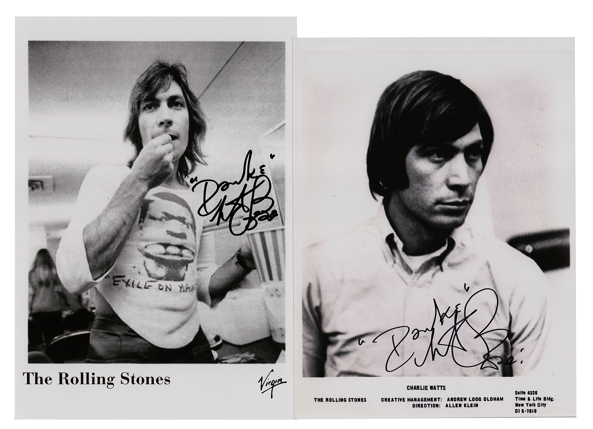 Two glossy 8 x 10 photos of Charlie Watts, each signed in black felt tip by the Rolling Stones drummer, adding "Danke" above. In fine condition.