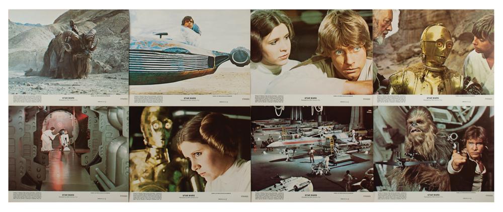 (20th Century Fox, 1977) Scarce complete set of mini lobby cards for George Lucas's classic space opera Star Wars, which consists of eight color 10 x 8 lobby cards that depict various scenes and characters from the film, including Princess Leia, R2-D2, C-3PO, Han Solo, and Chewbacca. Lower border of each features the film's title, copyright, NSS information, and identification code: "770021." In overall fine condition.