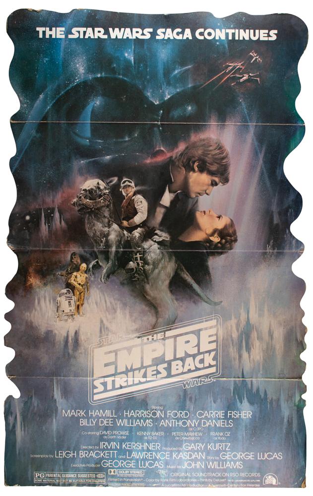 (20th Century Fox, 1980) Rare original color 35.5 x 56.25 promotional die-cut standee for the 1980 space opera The Empire Strikes Back, which features Roger Kastel's famous 'Gone With the Wind' style artwork of Hans Solo, Princess Leia, Luke Skywalker on a tauntaun, R2-D2, C-3PO, and Chewbacca below a large image of Darth Vader's upper helmet, with upper text reading: "The Star Wars Saga Continues." Lower portion contains cast and crew credits, production details, and "PG" rating; the folded bottom border features the GAU Union bug, NSS information, and reads: "Printed In U.S.A." and "Empire Strikes Back 8." In very good to fine condition, with dampstaining to the back, edge wear, and splitting to the right half of the lowest horizontal fold.