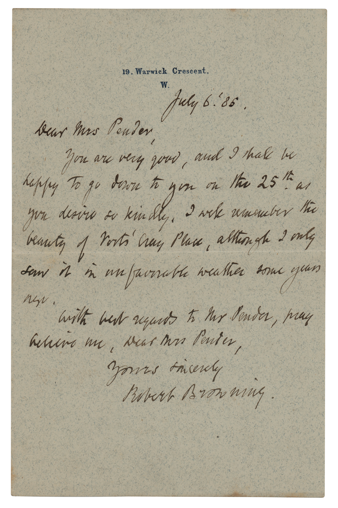 ALS, one page, 4.5 x 7, 19 Warwick Crescent letterhead, July 6, 1885. Handwritten letter to Emma Pender, the second wife of Sir John Pender, a Scottish textile merchant, politician, and submarine communications cable pioneer. In part: "You are very good, and I shall be happy to go down to you on the 25th as you desire so kindly. I well remember the beauty of Foots Cray Place, although I only saw it in unfavorable weather some years ago." In fine condition. Accompanied by the original mailing envelope hand-addressed by Browning; the upper right corner has been excised. Foots Cray Place was a mansion built in the Palladian style in the 18th century, and was one of the most elegant houses in Britain. John Pender leased the estate from 1876 and for the next 20 years divided his time between there and his London home.