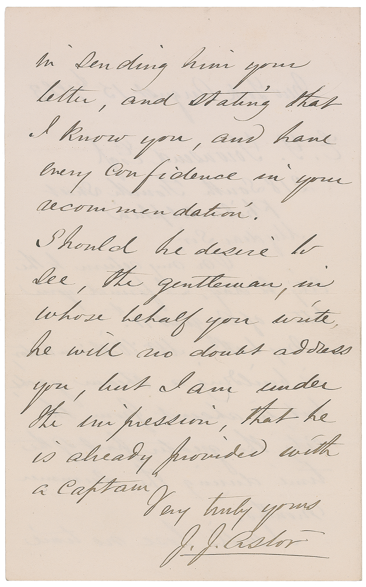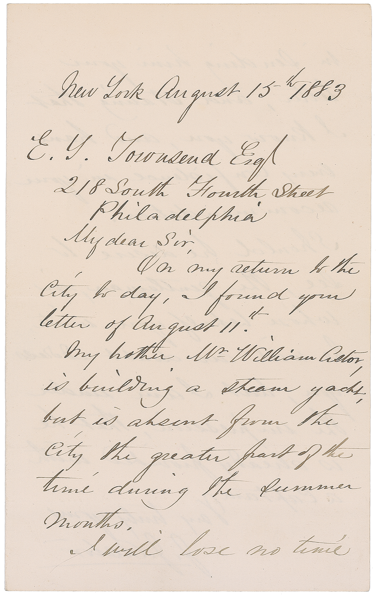 Member of the fabled Astor family of businessmen and financiers (1822-1890). The wealthiest family member of his generation, he served in the army during the Civil War (reaching the rank of brevet brigadier general) and later focused his business interests primarily on the acquisition and management of Manhattan real estate. ALS signed "J. J. Astor," one page both sides, 5 x 8, August 15, 1883. Handwritten letter to E. Y. Townsend of Philadelphia. In part: "My brother, Mr. William Astor, is building a steam yacht, but is absent from the city?I will lose no time in sending him your letter?he will no doubt address you, but I am under the impression, that he is already provided with a captain." In fine condition.