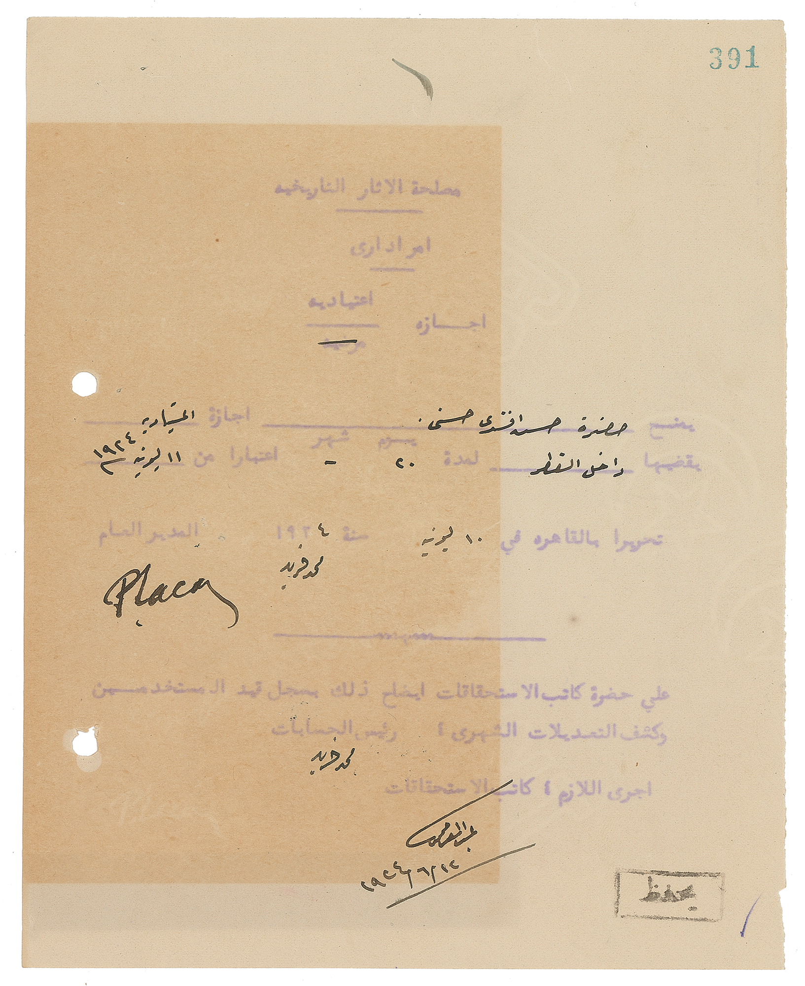 Egyptologist and philologist (1873-1963) who served as Egypt's director of antiquities from 1914 until 1936, and oversaw the 1922 discovery of the tomb of Tutankhamun in the Valley of the Kings by Howard Carter. Untranslated DS in Arabic, signed "P. Lacau," one page, 6.75 x 8.25, no date. A large block of toning and two filing holes to the left edge, otherwise fine condition.