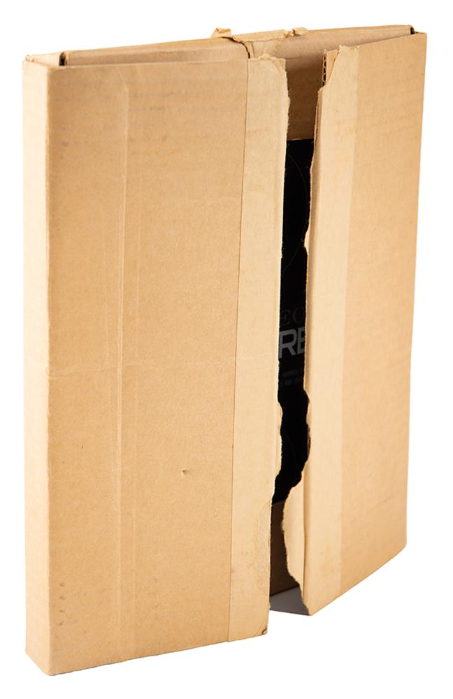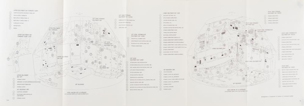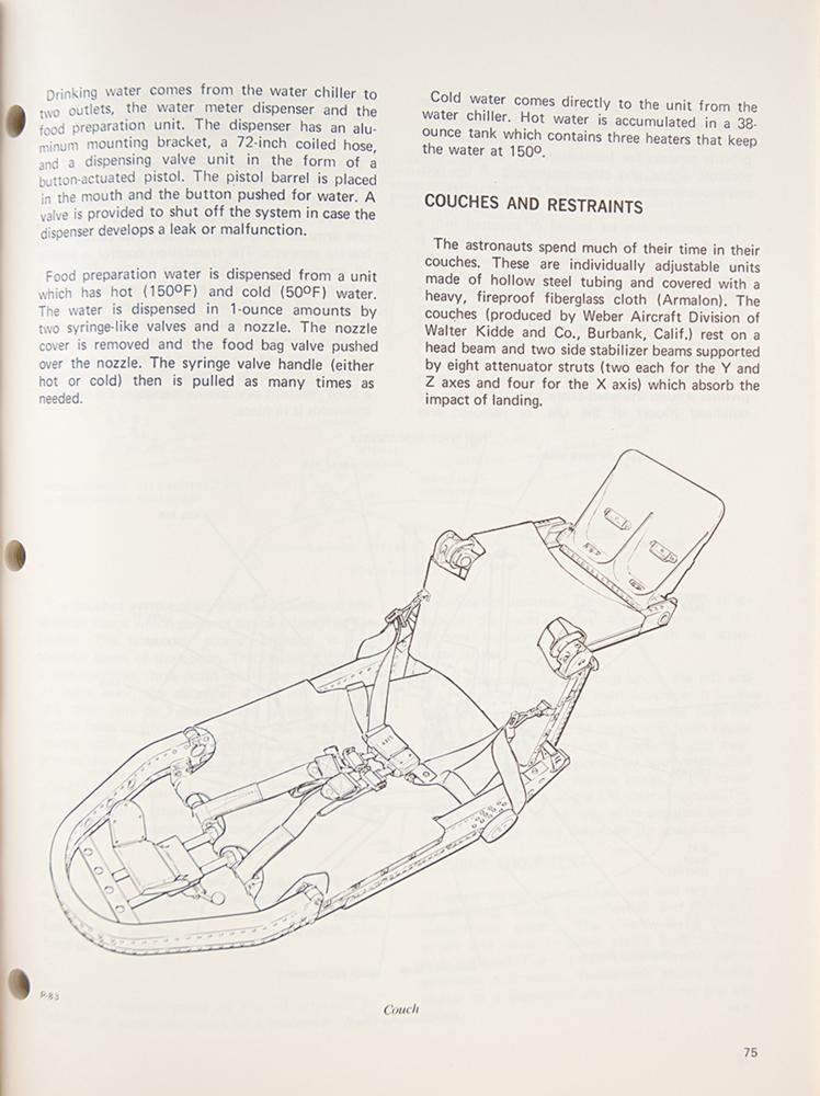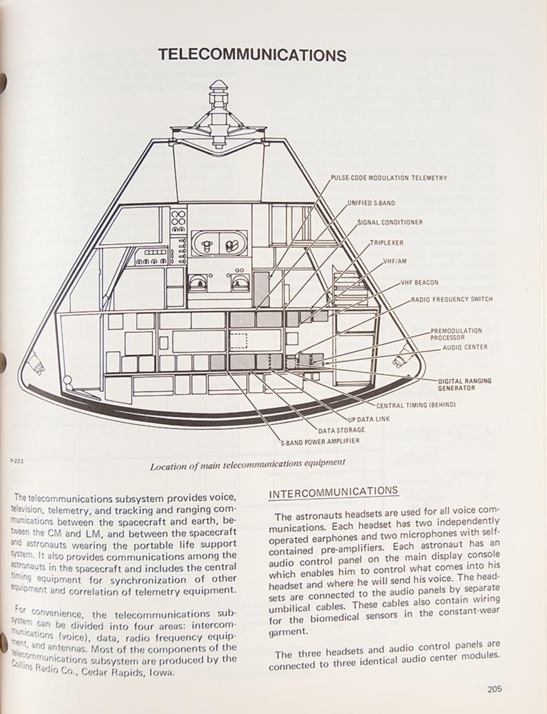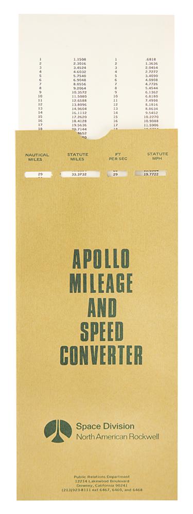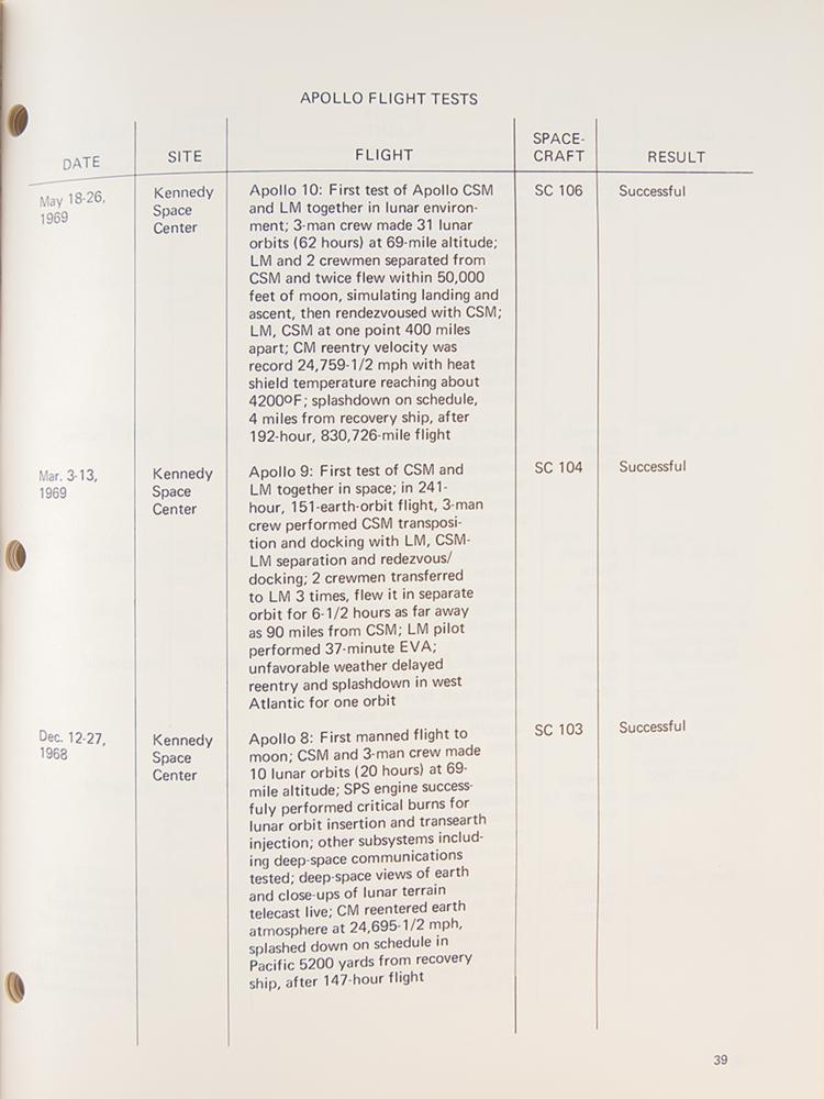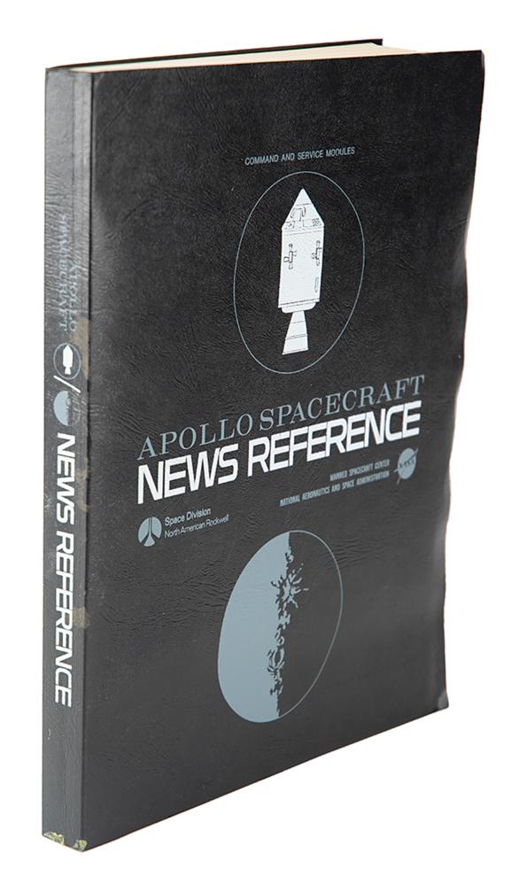 "Apollo Spacecraft News Reference" press guide prepared by the Space Division and their public affairs office at the North American Rockwell Corporation circa 1969, approximately 330 pages, 9 x 11, with tabbed sections including: Part 1-General (Apollo Program, Apollo Spacecraft, Launch Vehicles, etc.), Part 2-Modules (Command Module, Service Module, Lunar Module, Spacecraft-LM Adapter), Part 3-Subsystems (Crew, Displays and Controls, Docking, Earth Landing, etc.), Part 4-Support (Checkout and Final Test, Safety, Reliability and Training, Apollo Manufacturing), and Part 5-Reference (CSM Subcontractors, CSM Contract, etc.). The manual's black vinyl cover remains intact. In fine condition, with trivial wear to cover, including some light wear to spine. Includes its original cardboard box and an "Apollo Mileage and Speed Converter."