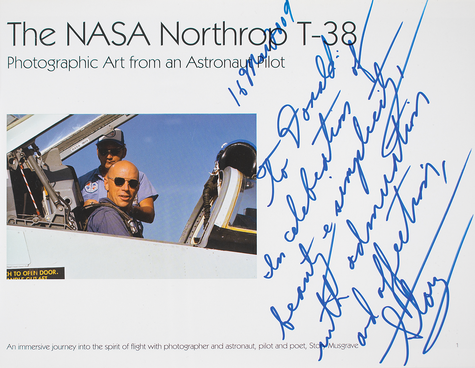 Signed book: The NASA Northrop T-38: Photographic Art from an Astronaut Pilot. First edition. Published by Lannistoria in 2009. Hardcover with dust jacket, 12.5 x 9.5, 264 pages. Signed and inscribed on the title page in blue felt tip, "16 Mar 2009, To Donald, In celebration of beauty & simplicity, with admiration and affection, Story." In fine condition. Accompanied by a photo of Musgrave at the time of signing.