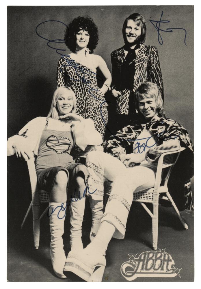 Desirable 4 x 6 cardstock promo photo of ABBA, signed in blue ballpoint by Benny Andersson, Agnetha Fältskog, Anni-Frid Lyngstad, and Björn Ulvaeus. In fine condition, with a tiny tack hole to top.