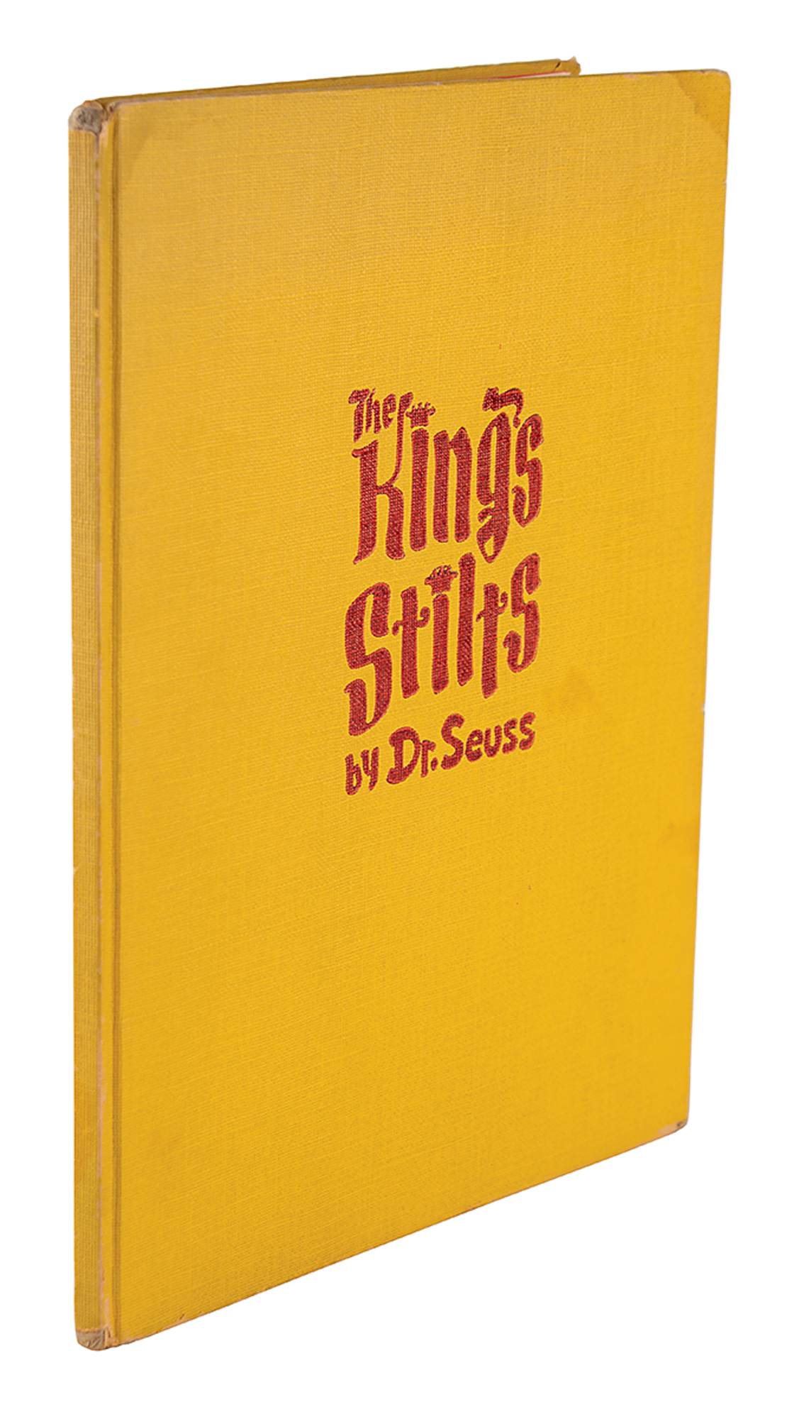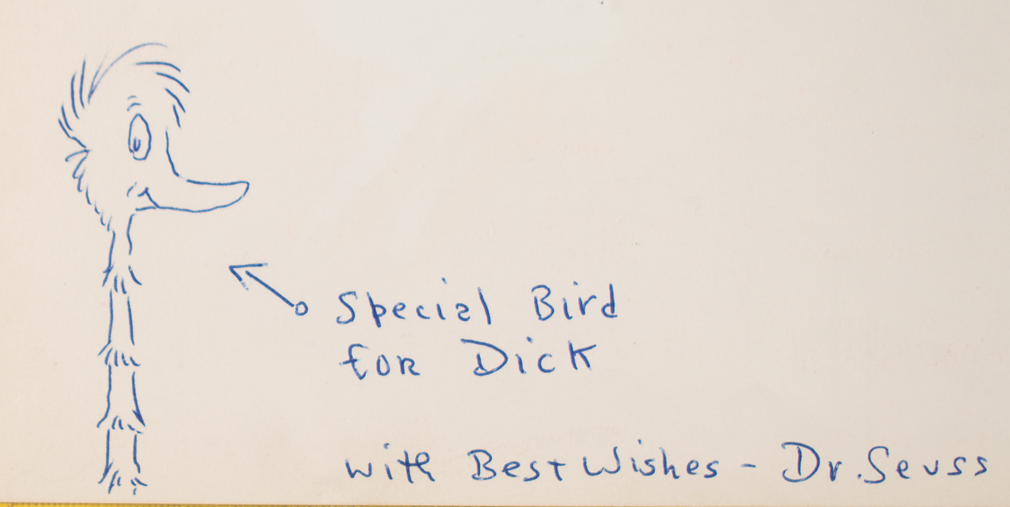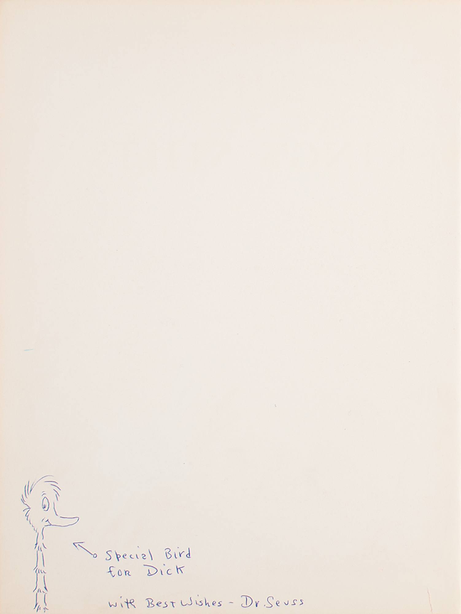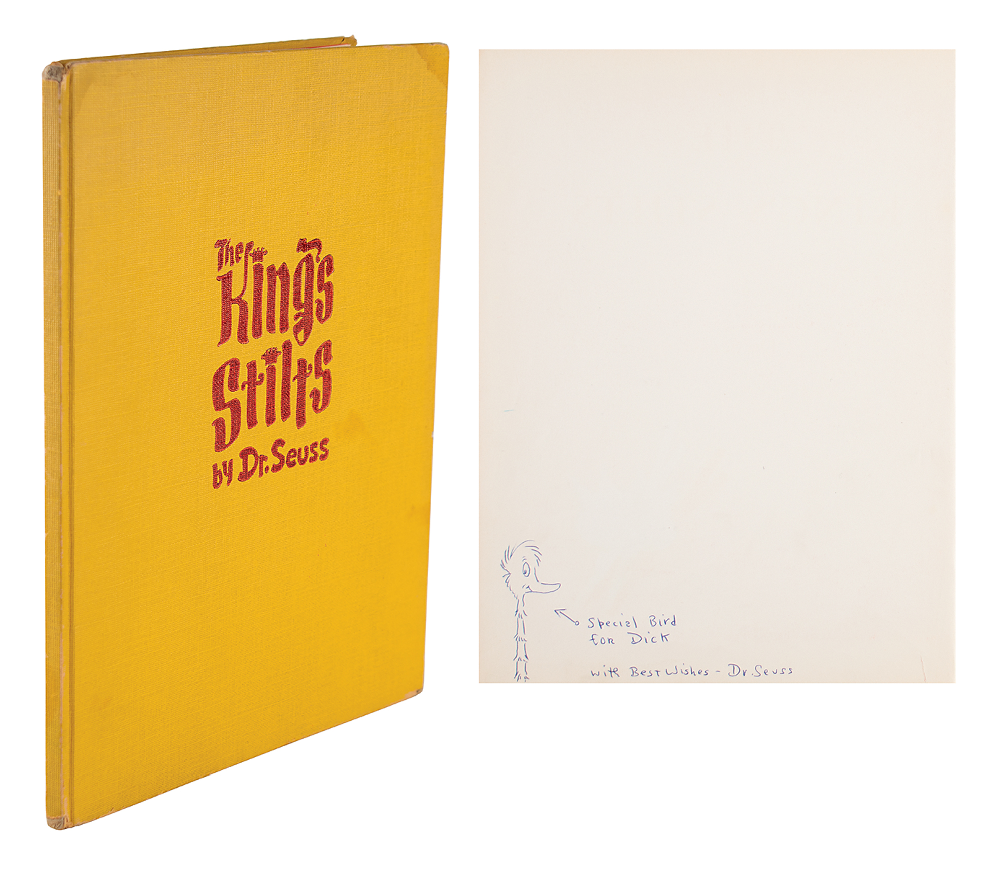 Signed book: The King's Stilts. Early edition. NY: Random House, 1939. Hardcover with sunshine-yellow boards and dark red-stamped title, 9.25 x 12, 44 pages. Signed and inscribed in ballpoint opposite the title page, "Special bird for Dick, with best wishes—Dr. Seuss," who draws an arrow to an amusing sketch of a long-necked bird. Autographic condition: fine, with a small tear to the far right bottom edge of the signed page. Book condition: VG/None, with some dampstaining to board's and a child's handwritten inscription to the dedication page.