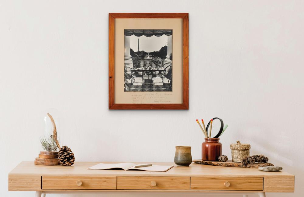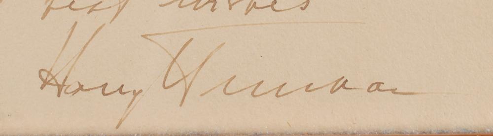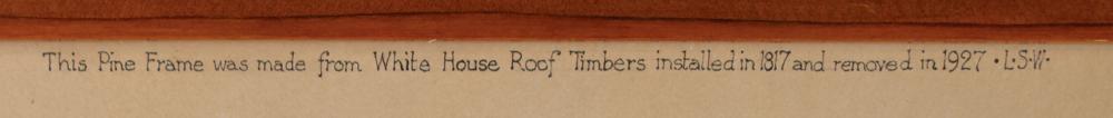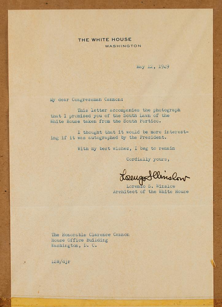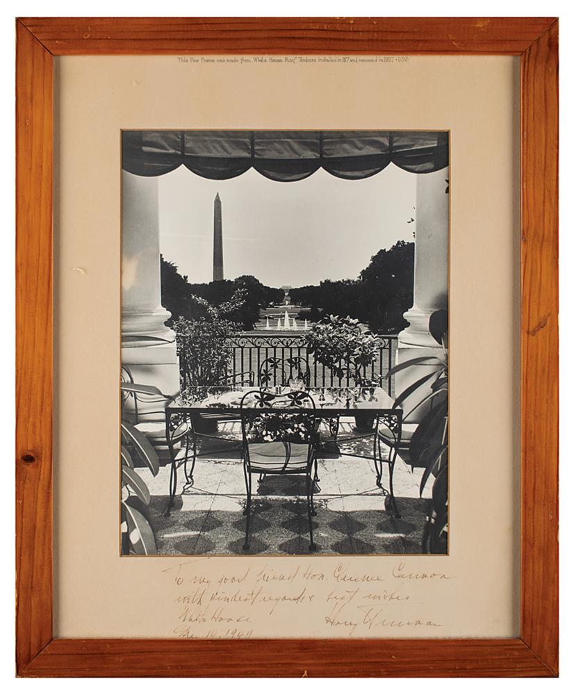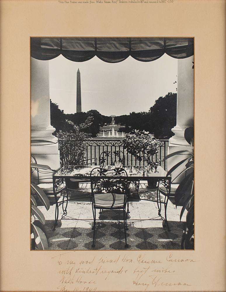 Magnificent matte-finish 10 x 13 photo of the White House lawn from the South Portico, with the Jefferson Memorial and Washington Monument in the distance, presented in its original 14.25 x 17.75 mat, signed and inscribed on the mat in fountain pen as president, "To my good friend Hon. Clarence Cannon, with kindest regards & best wishes, Harry S. Truman, White House, May 10, 1949." Displayed in its original 16.5 x 20 wooden frame, identified on the mat by Architect of the White House Lorenzo S. Winslow, "This pine frame was made from White House room timbers installed 1817 and removed in 1927, L.S.W." In fine condition, with a few small dings to frame. Accompanied by a transmittal letter from Winslow. Cannon was a longtime congressman from Missouri, serving from 1923 to 1964, who was chairman of the US House Committee on Appropriations throughout most of Truman's term as president. Such large and impressive White House relics are rare and highly sought after.