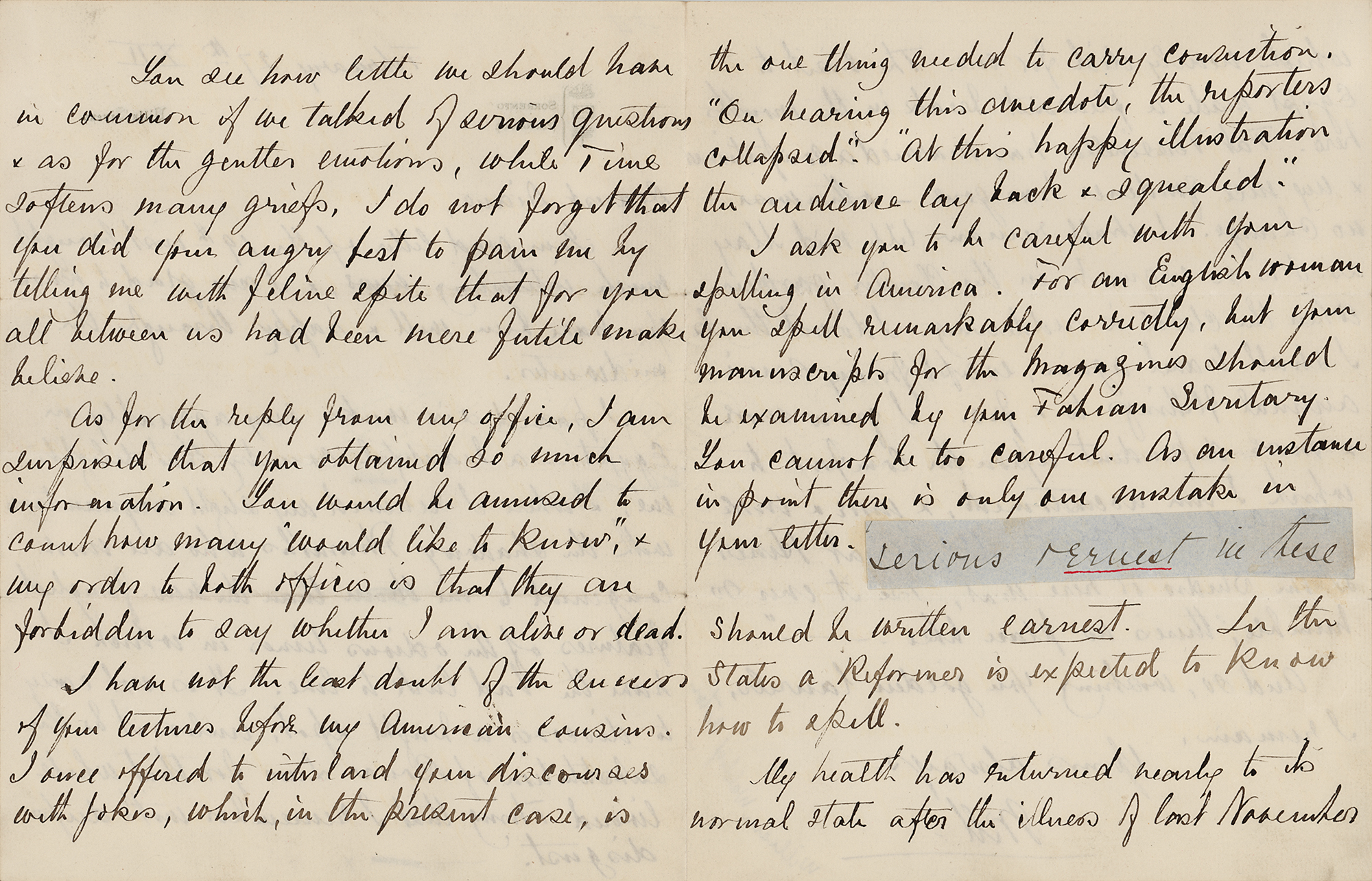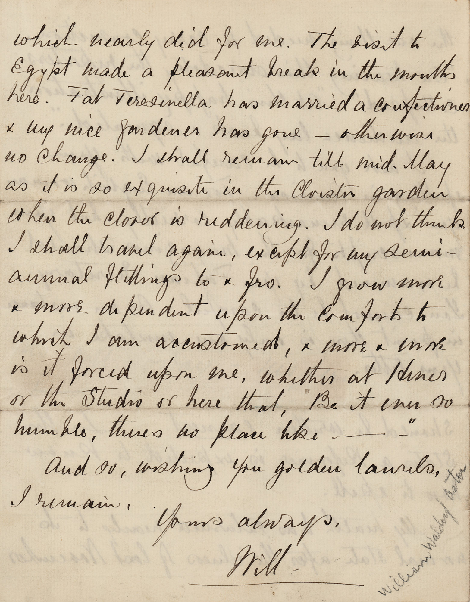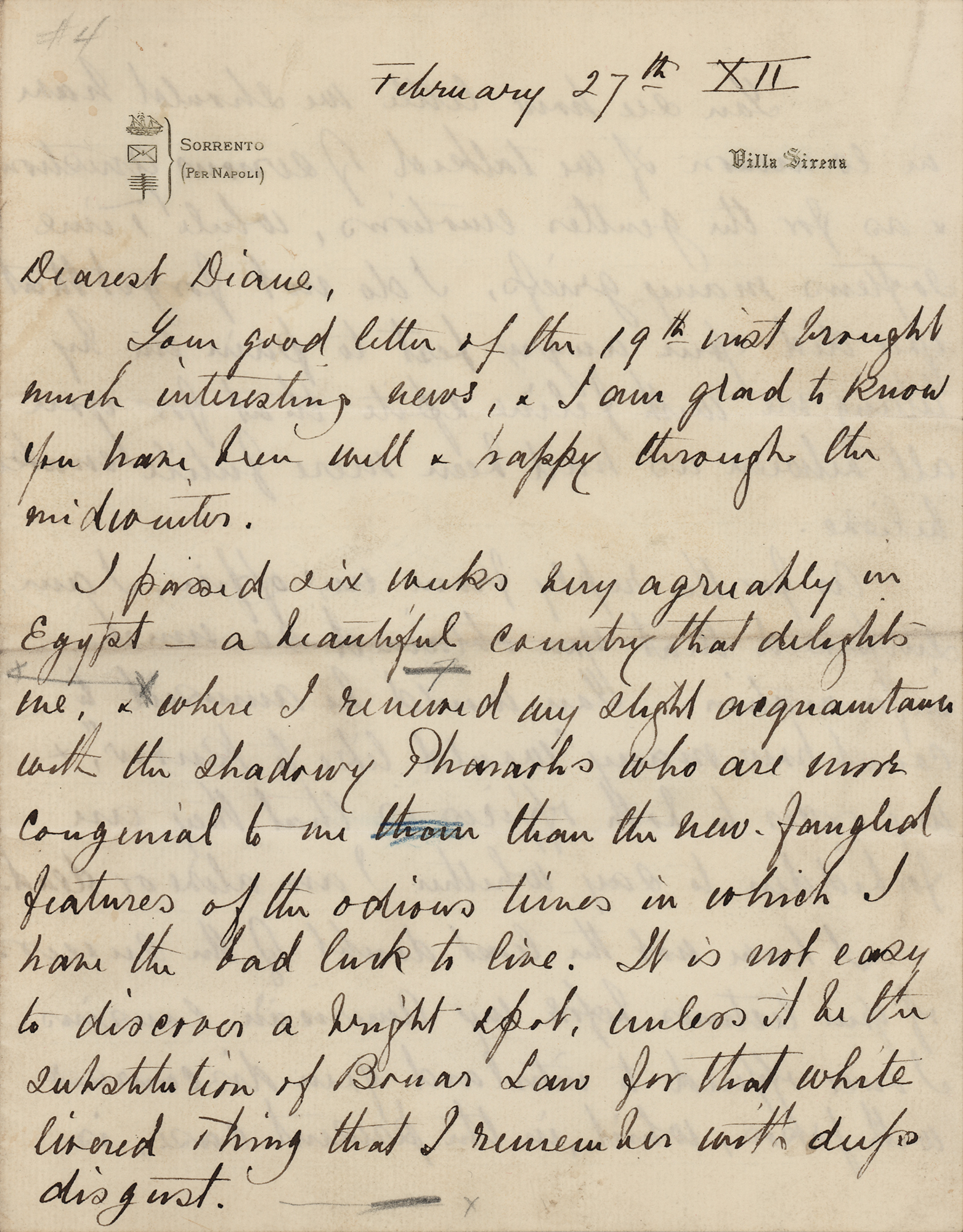 American-born statesman, philanthropist, and financier (1848-1919) of the prominent family of New York millionaires. ALS signed “Will,” four pages on two adjoining sheets, 7 x 9, Villa Sirena letterhead, February 27, 1912. Handwritten letter to "Diane," in part: "I passed six weeks very agreeably in Egypt—a beautiful country that delights me, & where I renewed my slight acquaintance with the shadowy Pharaohs who are more congenial to me than the new-fangled features of the odious times in which I have the bad luck to live?You see how little we should have in common if we talked of serious questions & as for the gentler emotions, while Time softens many griefs, I do not forget that you did your angry best to pain me by telling me with feline spite that for your all between us had been mere futile make believe?I ask you to be careful with your spelling in America. For an Englishwoman you spell remarkable correctly, but your manuscripts for the magazines should be examined?As an instance in point there is only one mistake in your letter. [Here, he affixes a clipped "ernest" from her letter] should be written earnest. In the States a Reformer is expected to know how to spell." In fine condition.