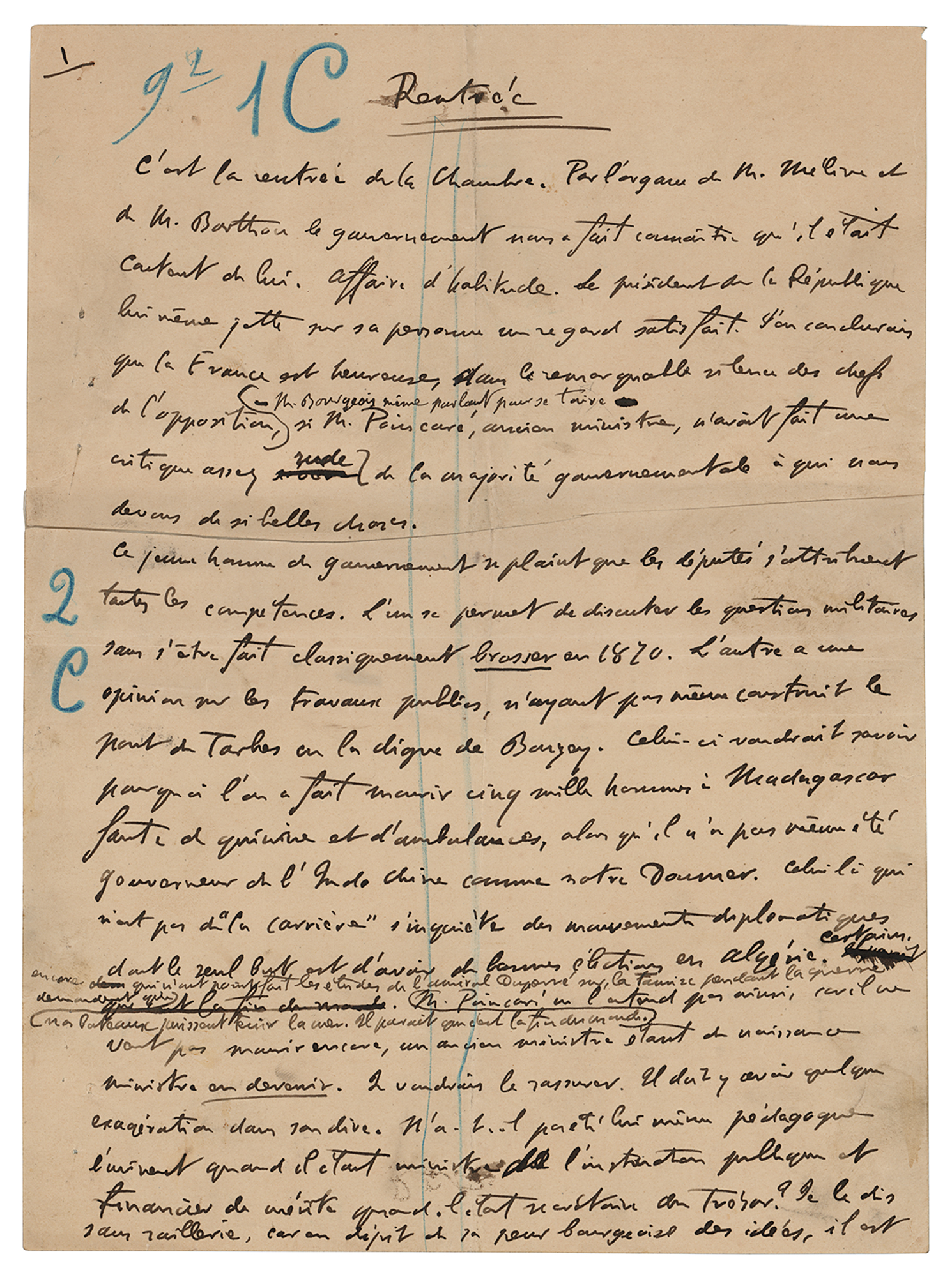 Unusual autograph manuscript, signed "G. Clemenceau," two pages, 7.25 x 10, no date but circa October 1897. Clemenceau's handwritten draft for a piece published under the title 'L'Antichambre' in L'Aurore on October 19, 1897, beginning (translated): "It is the return of the House. Through the organ of Mr. Méline and Mr. Barthou, the government let us know that it was happy with him. Usual business. The President of the Republic himself casts a satisfied look on his person. I would conclude that France is happy, in the remarkable silence of the keys to the opposition - despite the late days of the last hour - if M. Poincaré, former Minister, had not made a rather harsh criticism of the government majority to whom we owe such beautiful things." In very good condition, with blue editorial notations to the text, and both pages sliced and reassembled with tape on the reverse.