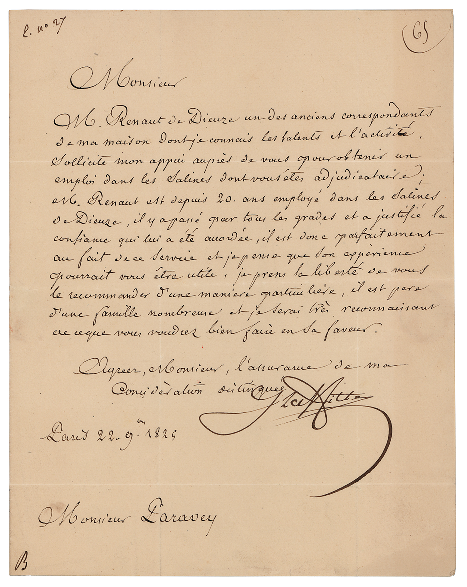 French banker and politician (1767-1844) who was an important figure in the development of new banking techniques during the early stages of industrialization in France. LS in French, signed “J. Laffitte,” one page, 6.25 x 8, November 22, 1829. Untranslated letter by Laffitte. In fine condition.