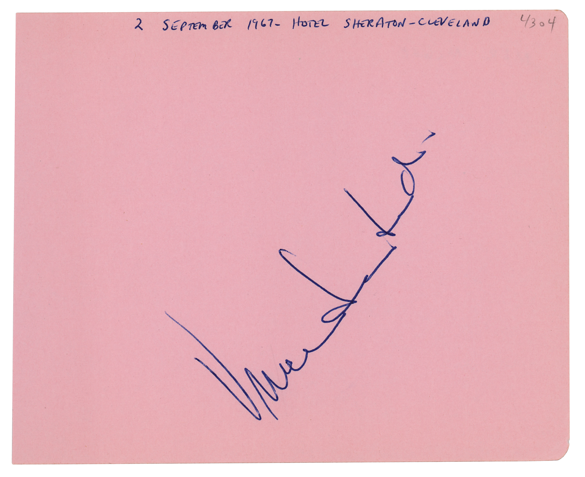 Ballpoint signature, "Vince Lombardi,” on a light pink 5.5 x 4.5 album page. Collector's notations date the signature to the Hotel Sheraton in Cleveland, Ohio, on September 2, 1967. In very fine condition. Lombardi signed this album page two weeks before the Green Bay Packers began the 1967 NFL season, which culminated in the team beating the Dallas Cowboys in the famed NFL Championship Game commonly known as the 'Ice Bowl.'