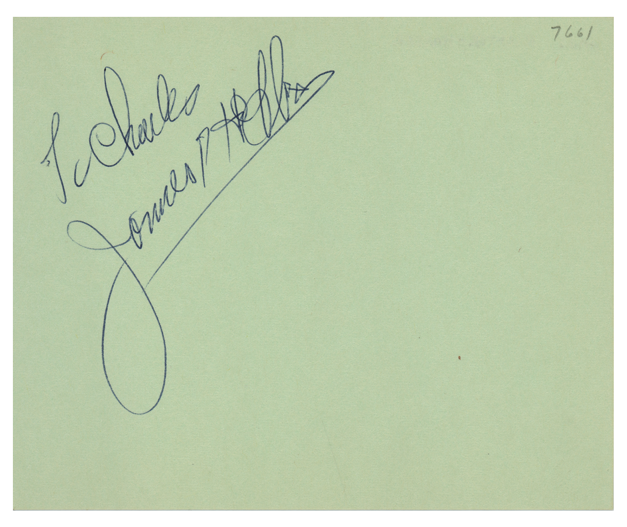 Ballpoint signature and inscription, "To Charles, James R. Hoffa,” on a light green 5.5 x 4.5 album page. In very fine condition.