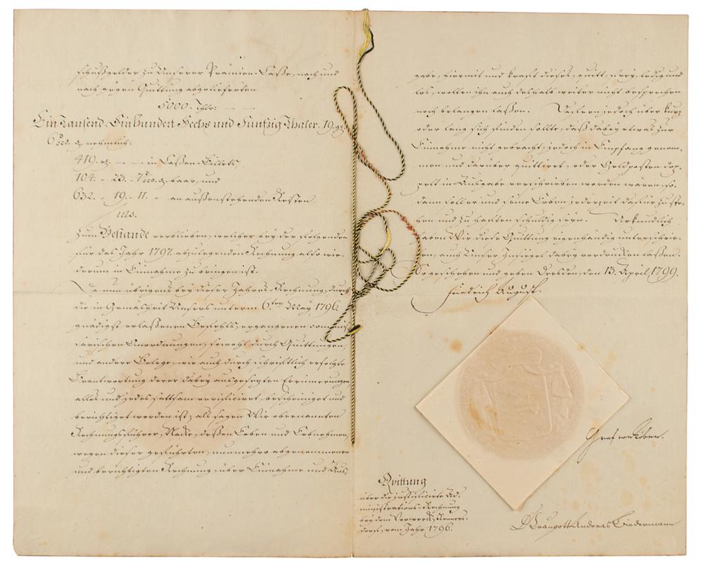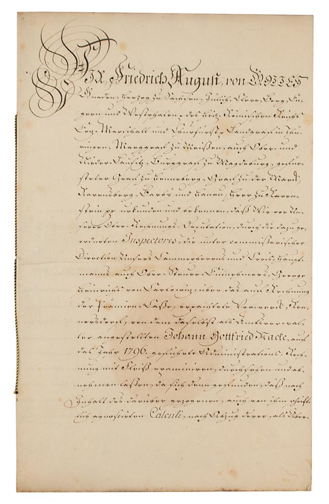 King of Saxony (1750-1827) from 1806 to 1827 who became one of Napoleon's most loyal allies and lost much of his kingdom to Prussia at the Congress of Vienna. Manuscript DS, in German, signed "Friedrich August," three pages on two adjoining sheets, 8.25 x 13.25, April 13, 1799. Untranslated official document signed at the conclusion by Frederick Augustus I as Elector of Saxony. In very good to fine condition, with scattered staining (including some seal-related staining to the first page), a rusty circular paperclip impression to the last page, and the wax that once secured the paper seal absent; the embossed seal, however, is present.