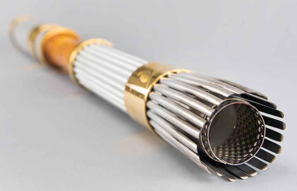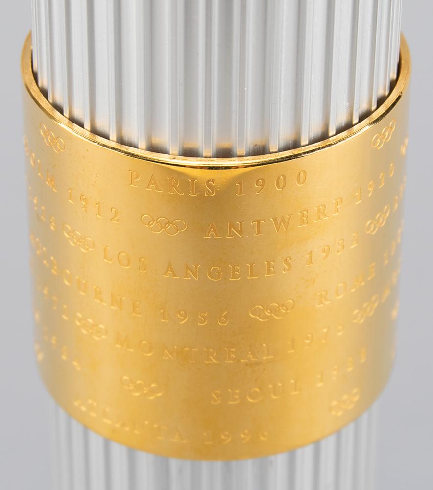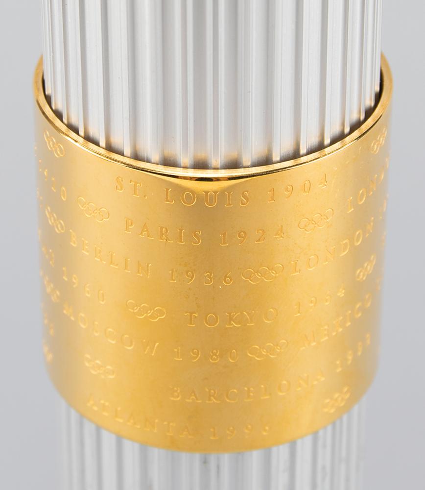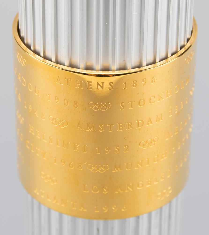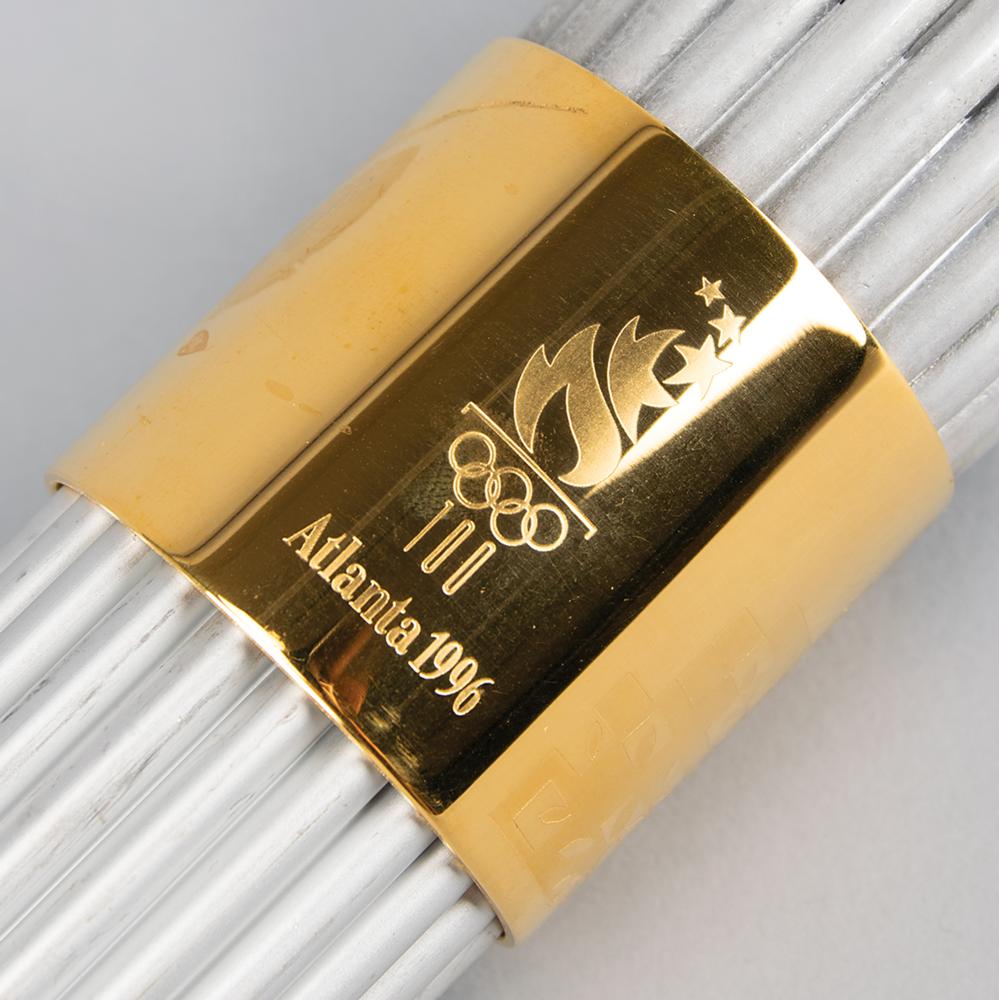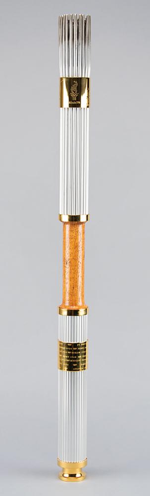 Official 1996 Atlanta Summer Olympics torch, constructed of gold-plated brass, aluminum, and Georgian pecan hardwood, measuring 31.75″ in length and 2.5″ at its widest point. Designed by Peter Mastrogiannis, the wooden handle represents the connection of the flame between heaven and earth, and the torch's twenty-two reeds, representing every host city of the Olympic Games since 1896, are gathered by bands at the top and bottom, with the top displaying the Atlanta Games logo and the quilt of leaves design, and the bottom band listing all Olympic cities and their dates since 1896; the designs to bands bear some fading. The torch relay was run from April 27 to July 19, 1966, and covered 26,875 km across the United States by over 12,000 torchbearers. Its journey included a trek on the Pony Express, a ride on the Union Pacific Railroad, and the first instance in which an Olympic relay torch made its way into space when it was carried aboard Space Shuttle Columbia as part of STS-78. A very appealing relay torch from the Centennial Olympic Games.