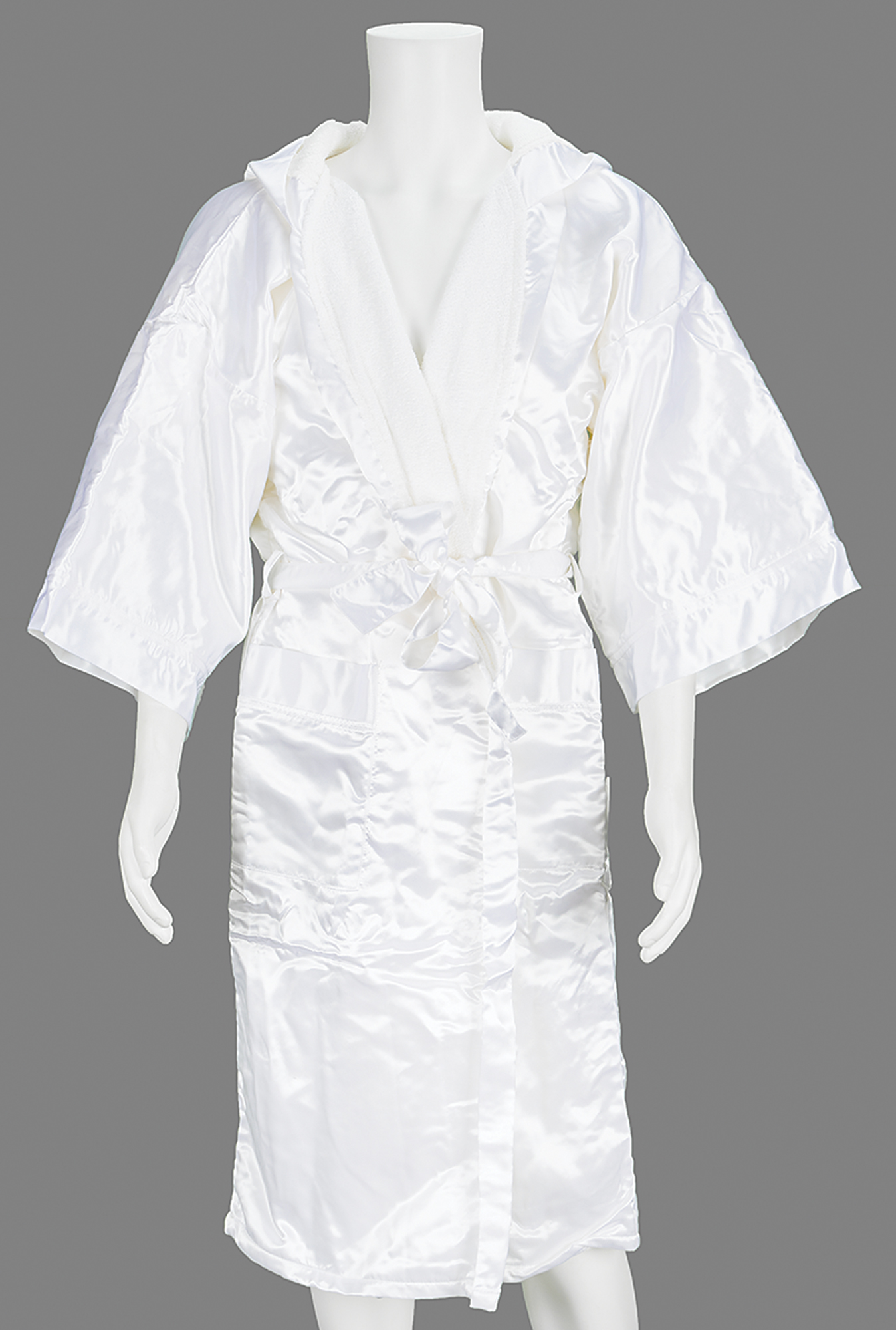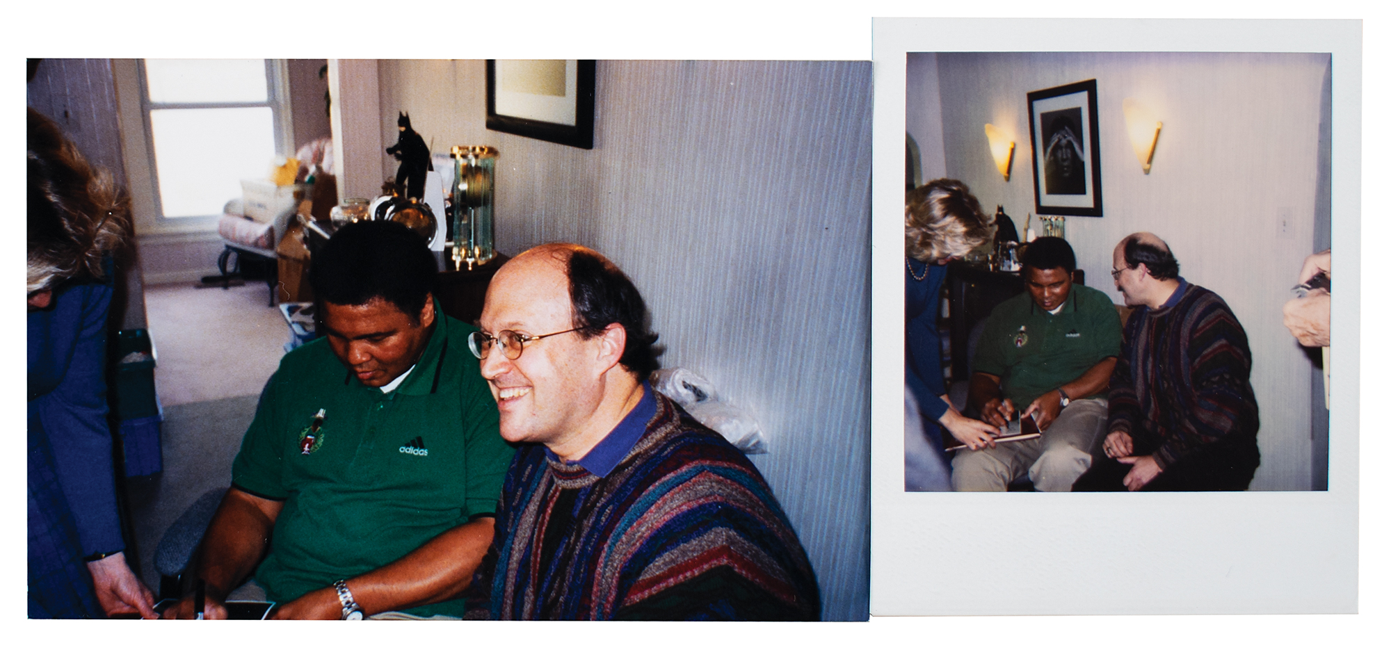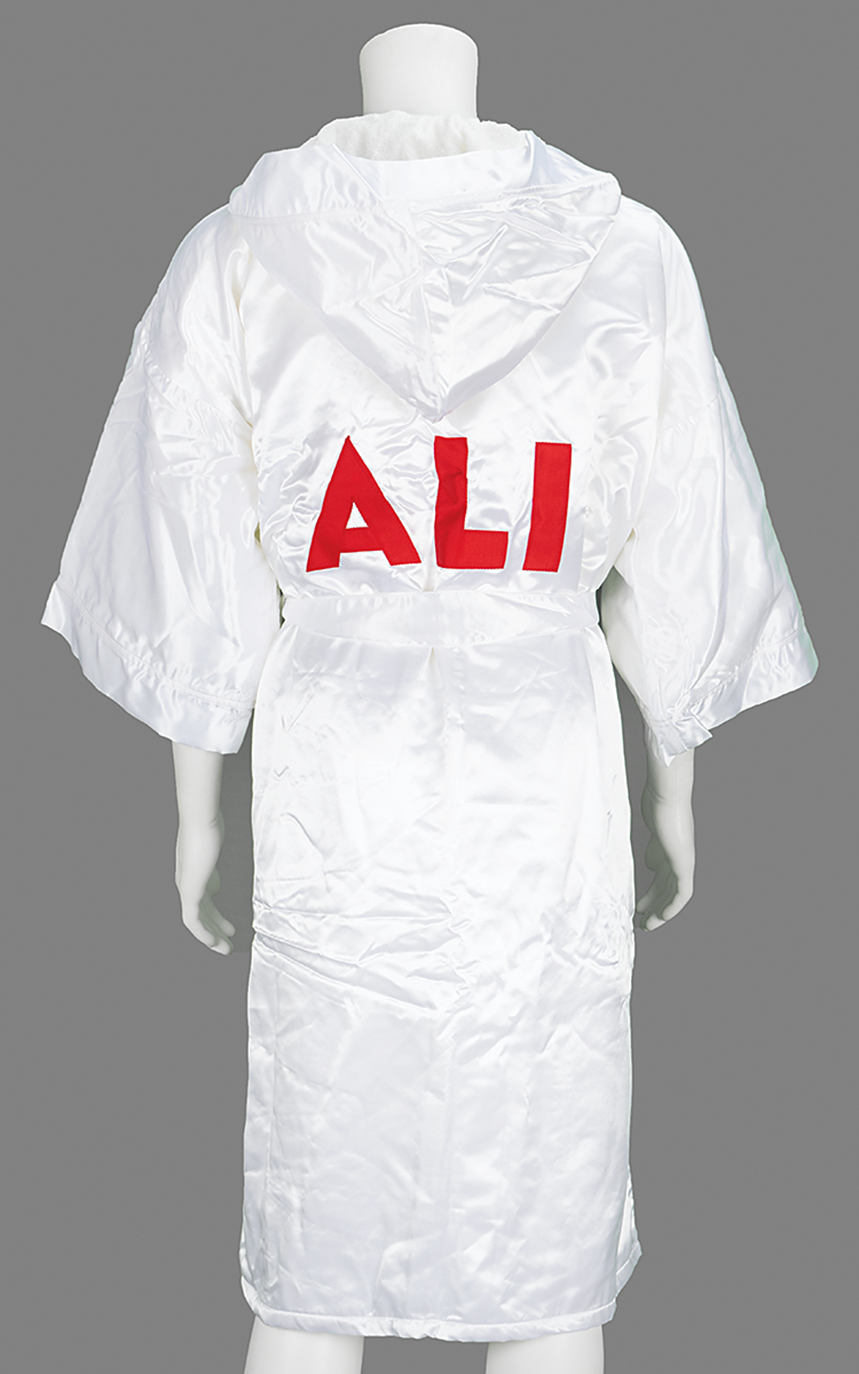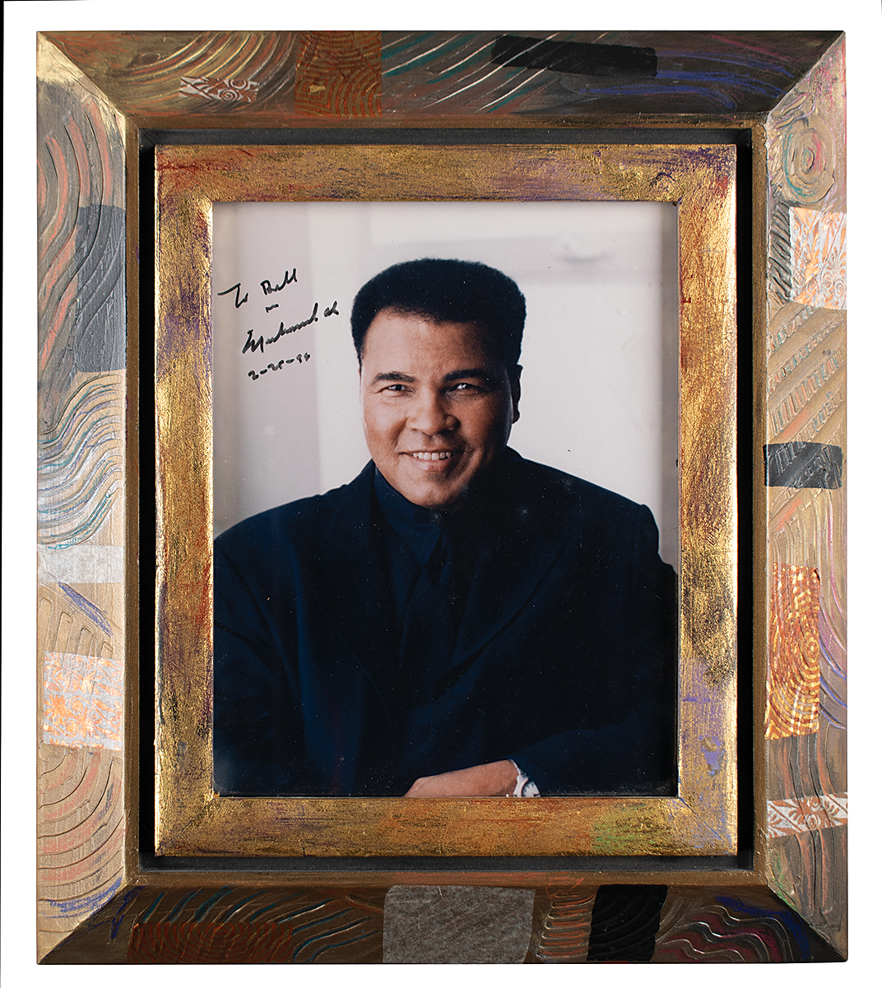 Color satin-finish 7 x 9 photo of 'The Greatest' wearing a dark suit and smiling into the camera, signed and inscribed in black felt tip to Chicago Sun-Times entertainment columnist Bill Zwecker, "To Bill, from, Muhammad Ali, 2-25-89.” Ornately framed to an overall size of 13 x 14.75. In fine condition. Accompanied by two photos of Ali taken at the time of signing, and a rare promotional boxing robe from the 2001 biopic Ali.