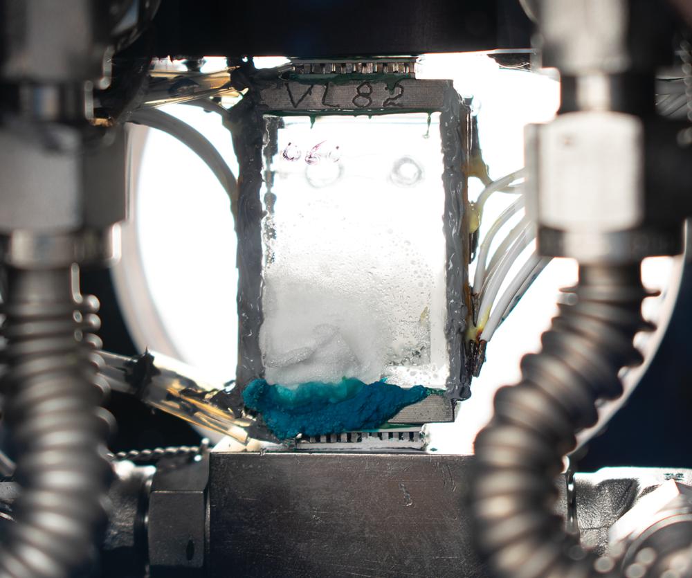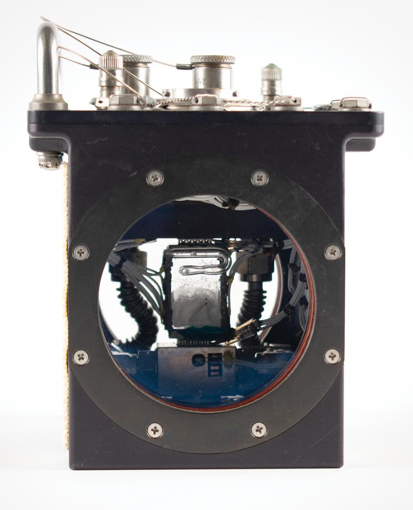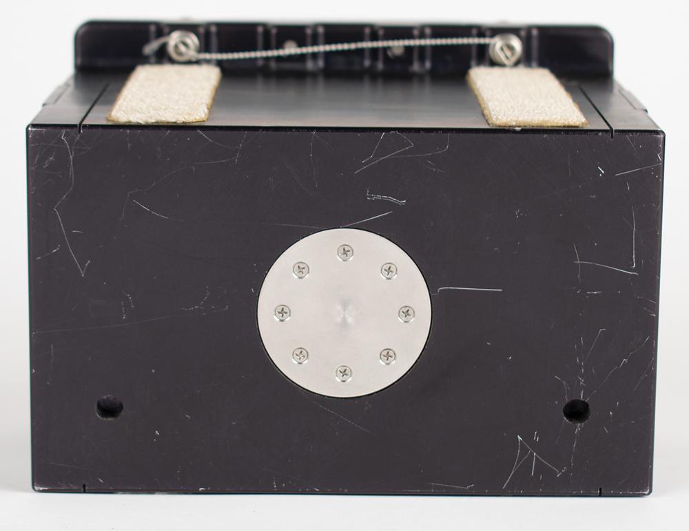 Spacelab crystal growth experiment assembly from the Space Shuttle program, 6.5" x 5" x 6", with two female Velcro strips affixed to the top and bottom, the latter of which is stamped: "96M80785-1, S/N 004." The front, which bears an identical serial number, is marked "J10" near a large circular port, and has an upper handle, two capped air valves, and a pair of rotating "Inlet" and "Outlet" ports, which are marked the same: "S-W, ZF-544E-4, A2Q88." Both sides of the box feature porthole-style windows that reveal the internal crystal growth experiment.