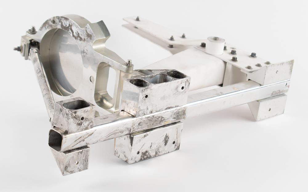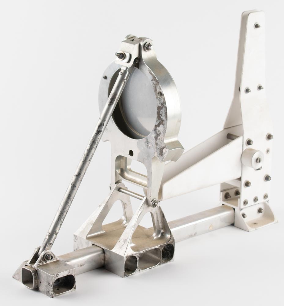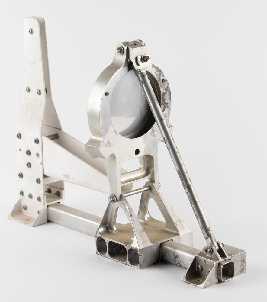Rare Surveyor Lunar Lander Alpha Scattering Equipment bracket, 16.26" x 12" x 4", designed as a deployment mechanism for the experiment sensor head that would measure the concentration of various elements in the lunar soil. Upon a successful moon landing, the Surveyor Alpha Scattering Experiment sensor head would be released by the deployment mechanism and lowered to the lunar surface upon command via a nylon cord wrapped around a geared cylinder. In very good to fine condition, with overall scattered wear and marks from extensive use. A decidedly scarce and impressive piece of flight hardware.