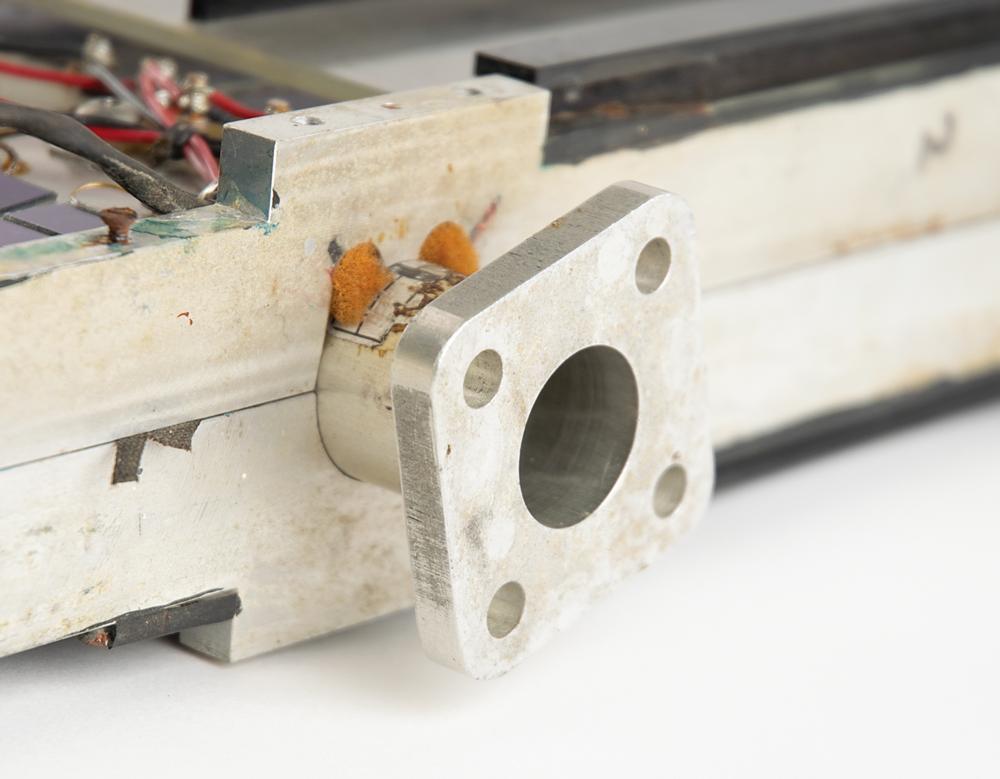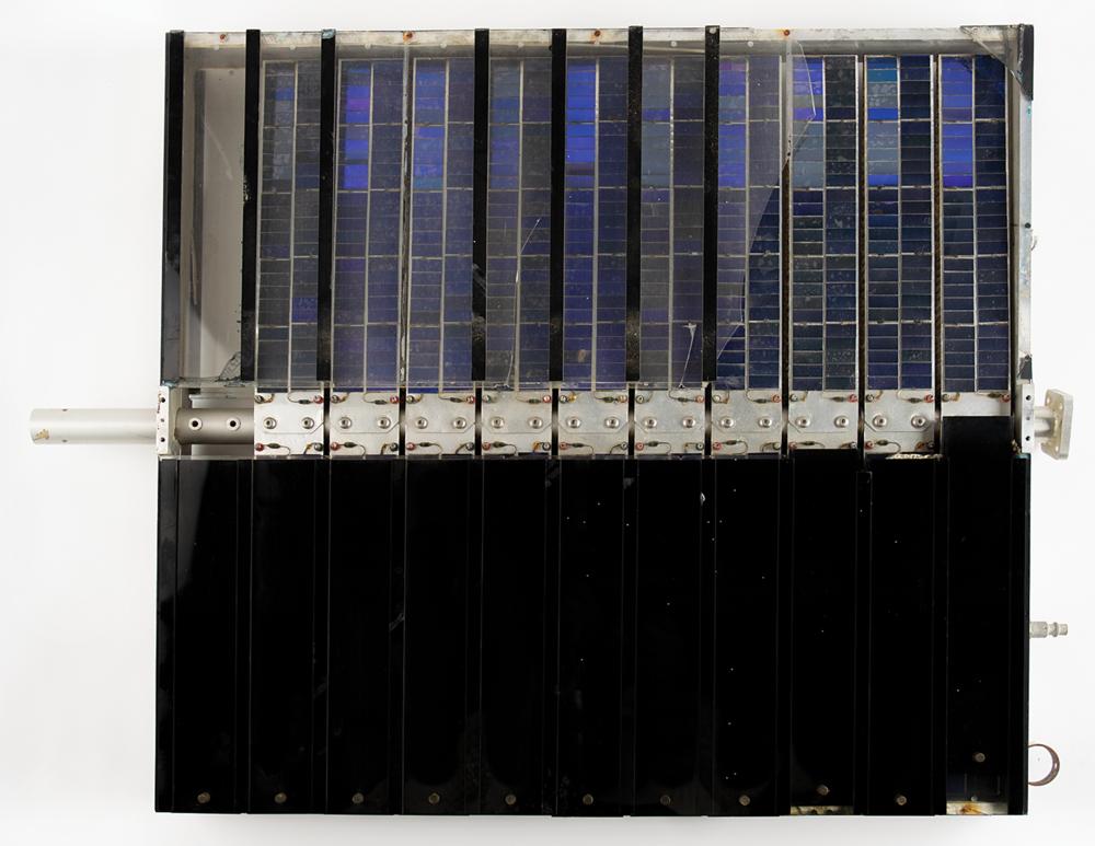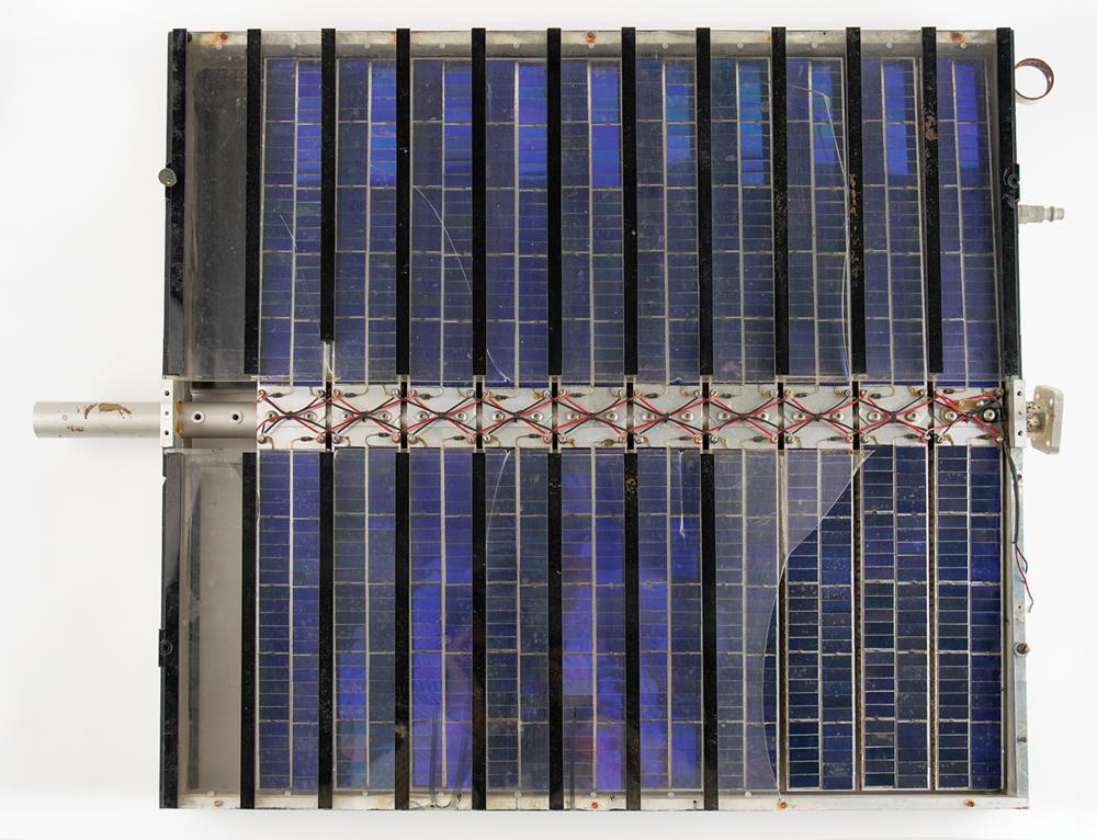 Solar panel for a Pioneer lunar orbiter probe, the type that was launched into space by the Atlas-Able expendable launch system in 1959 and 1960. The panel approximately measures 27" x 21", and contains 20 rows of solar cells to either side. The panel is covered by protective plastic, portions of which have since broken, that can be fully removed if so desired; the panel itself is in fine condition and presented in a large metal carrying case that weighs roughly 27 pounds.
