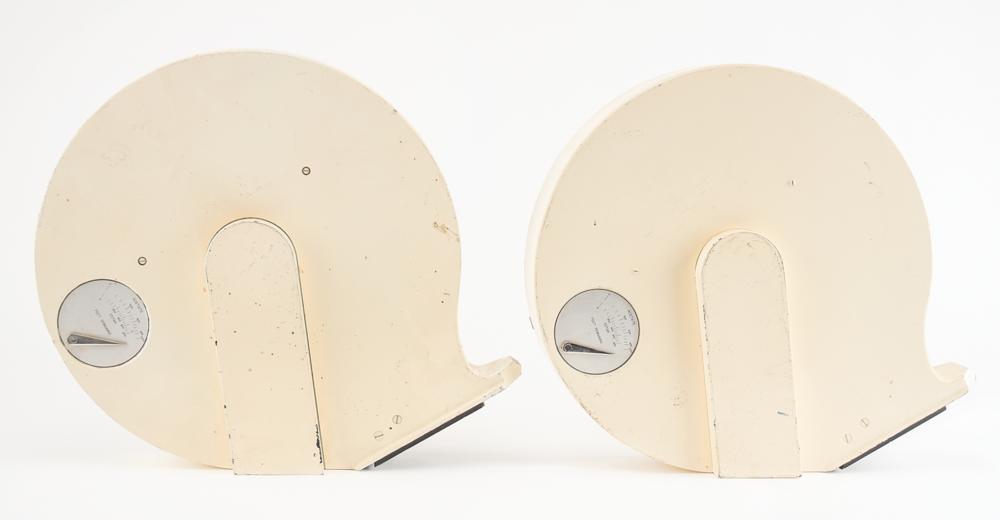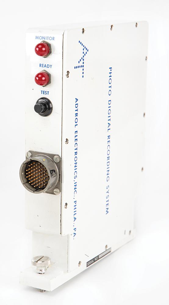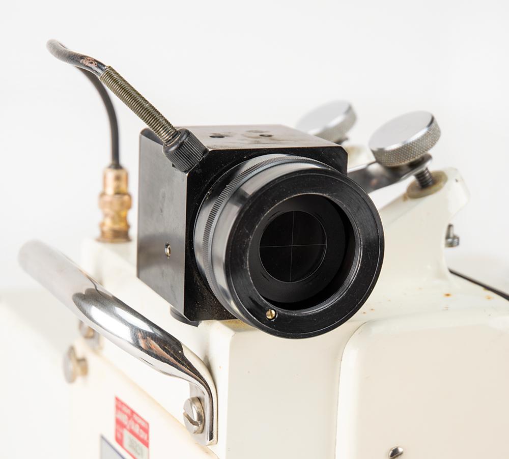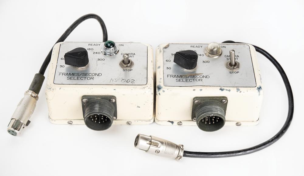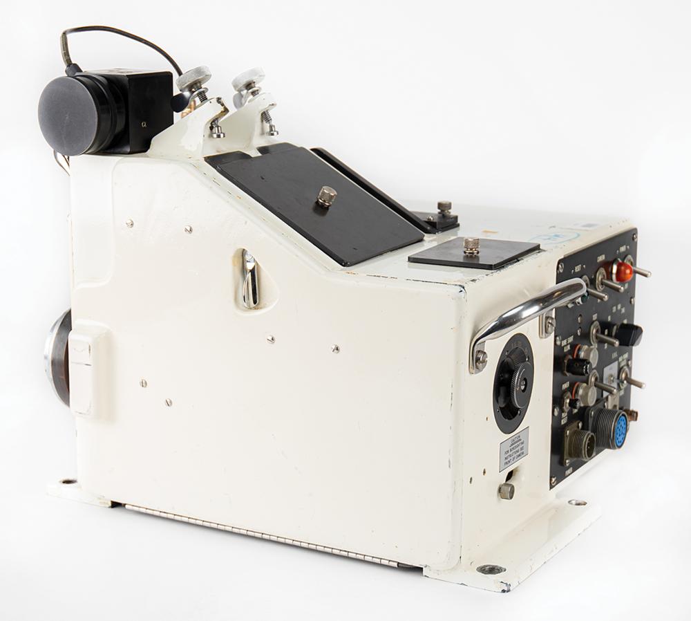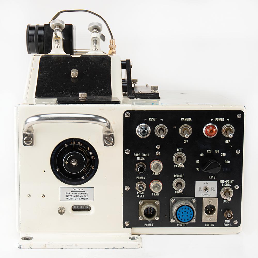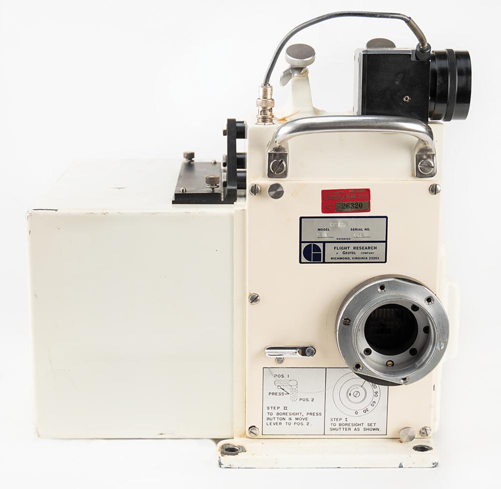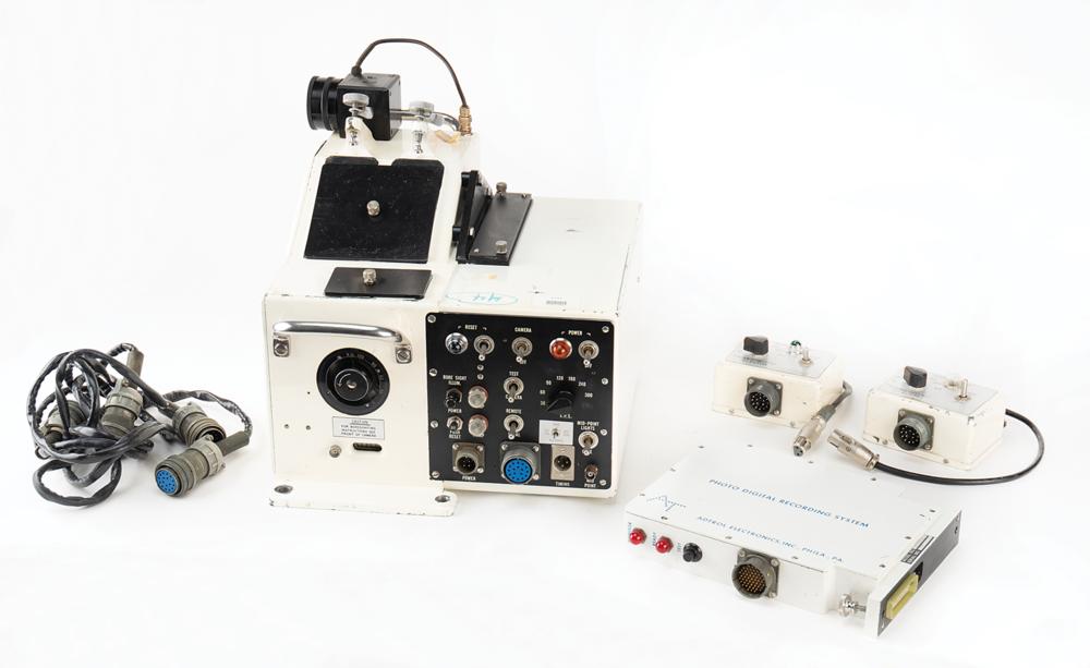 Circa 1981 Flight Research Model 705-A High Speed 35mm camera out of the White Sands Missile Range in New Mexico. The camera, which measures (without mounted canisters or recording system) 13" x 14" x 15.25" and weighs roughly 65 pounds, features a latched side compartment that opens to reveal the beautiful interior mechanics, with two additional eyepieces and detailed instructions for film loading and lubrication. The back control panel with power and remote ports is located next to a boresighting dial, and the front features a shutter lever and the lens outlet (lens not present), with a U.S. Government Land/Air Division property label numbered "26320," and a Flight Research (Geotel Company) parts label marked "Camera, Model 705A, Serial No. 044." The eyepiece is placed on the top of the camera body, which bears mounting space for two acetate film canisters measuring 12" in diameter, and a photo digital recording system; all three of which are included, as are two 'frame/second selector' modules, various connection wires and cords, and the original hardshell carrying case from Flight Research, which measures 26.5" x 16.5" x 17.75". In fine, untested condition; the carrying case features scattered marks and scuffs.