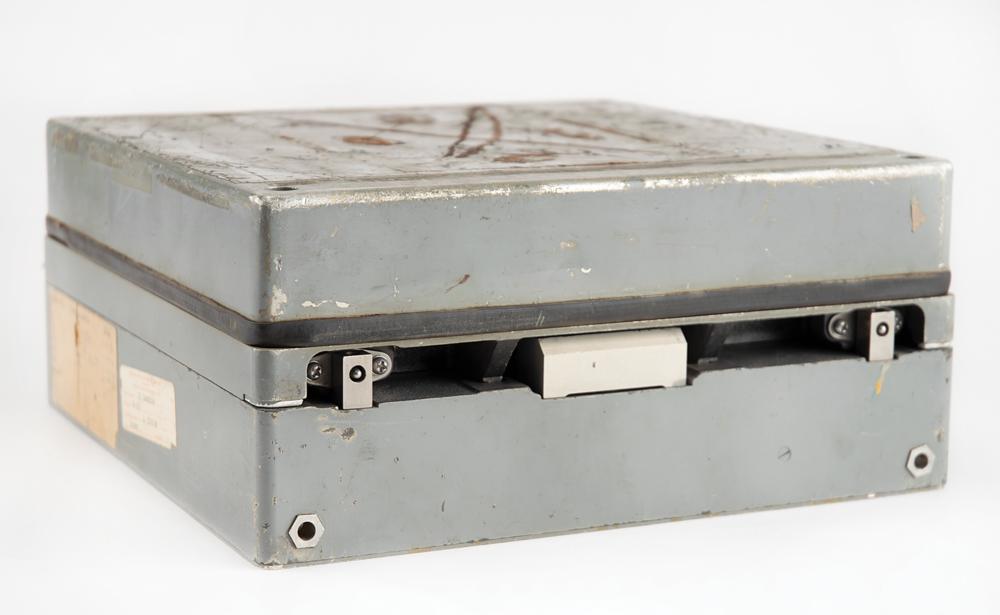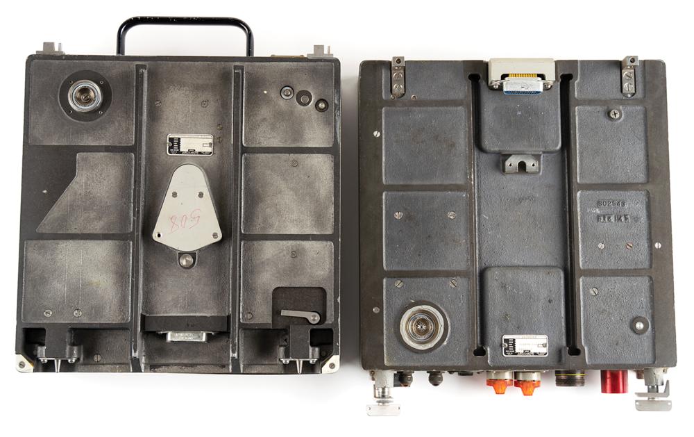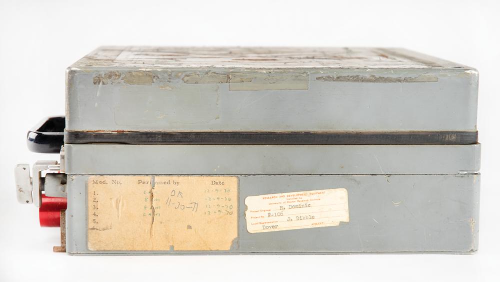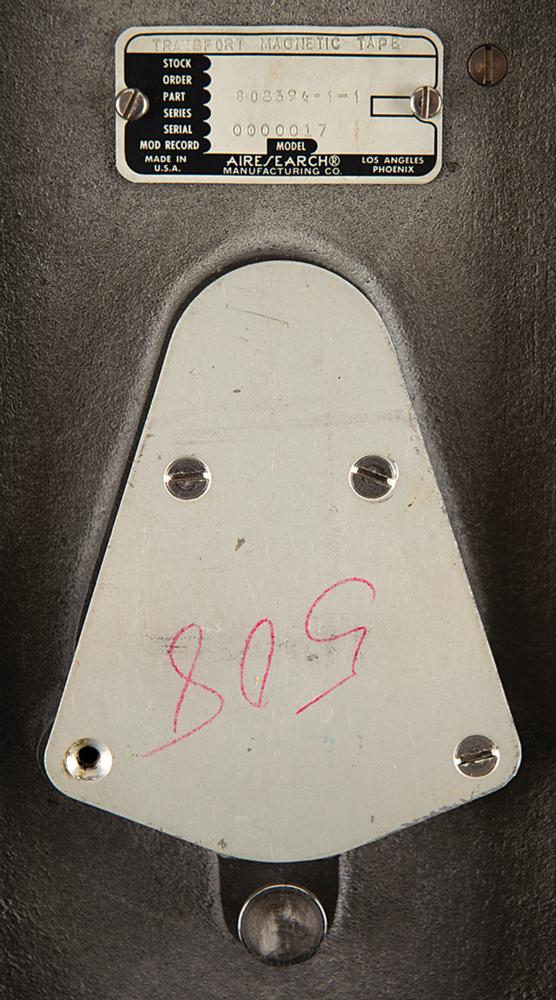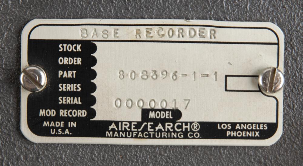 MXK-420/A24A Flight (Signal) Data Recorder procured under an Air Force contract, measuring 11" x 12.75" x 5", with an Airesearch plate on the front: "MXK-420/A24A Signal Data Recorder, Part 538956-2-1, Serial 0000017, Contract AF33-657-15113." Intended for installation on either combat or military transport aircraft. Applied on the side are a label filled out with modification dates, and a Dayton Research Institute label identifying the associated project as "F-106." Exhibits some toned adhesive remnants on the top.