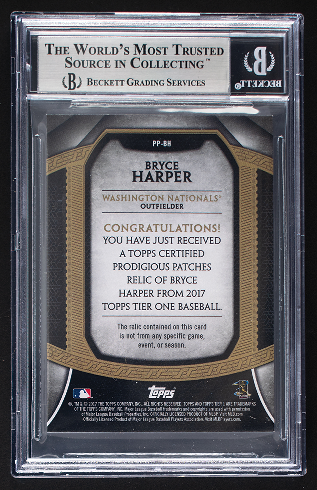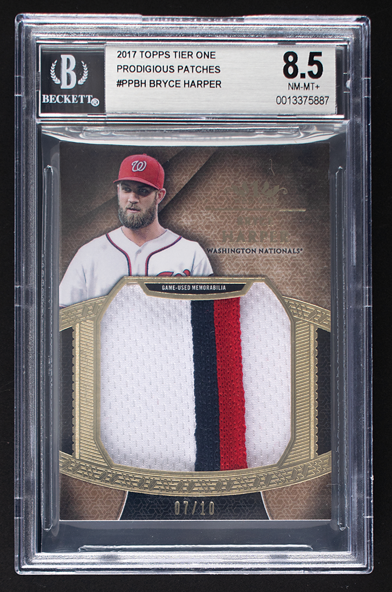 Graded by BGS NM-MT+ 8.5. Attractive game-used jumbo patch card of Washington Nationals superstar Bryce Harper, numbered 7/10, featuring a red-and-black patch stripe against white uniform material.