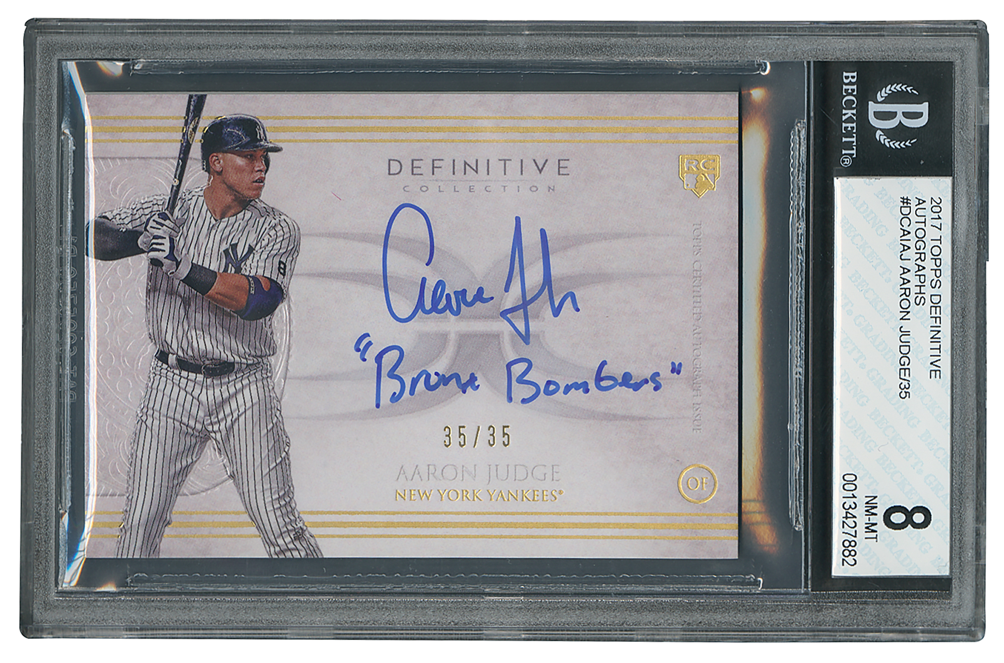 Graded by BGS NM-MT 8, with an autograph grade of 10. Fantastic autographed card of New York Yankees slugger Aaron Judge, numbered 35/35, nicely signed in blue felt tip, "Aaron Judge, 'Bronx Bombers.'"
