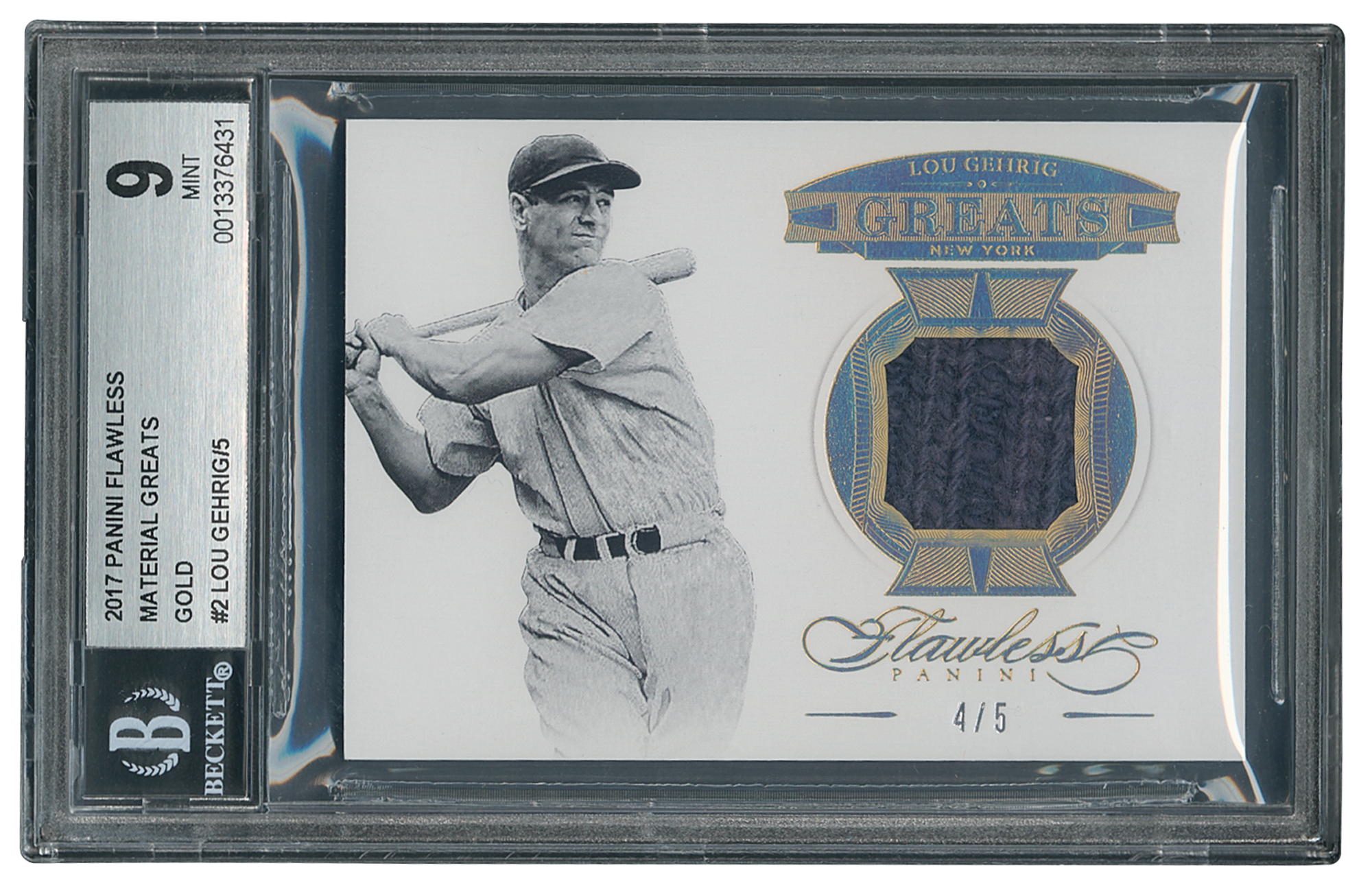 Graded by BGS MINT 9. Sought-after relic card of the 'Iron Horse' Lou Gehrig, numbered 4/5, featuring a dark gray knit swatch of game-used material.