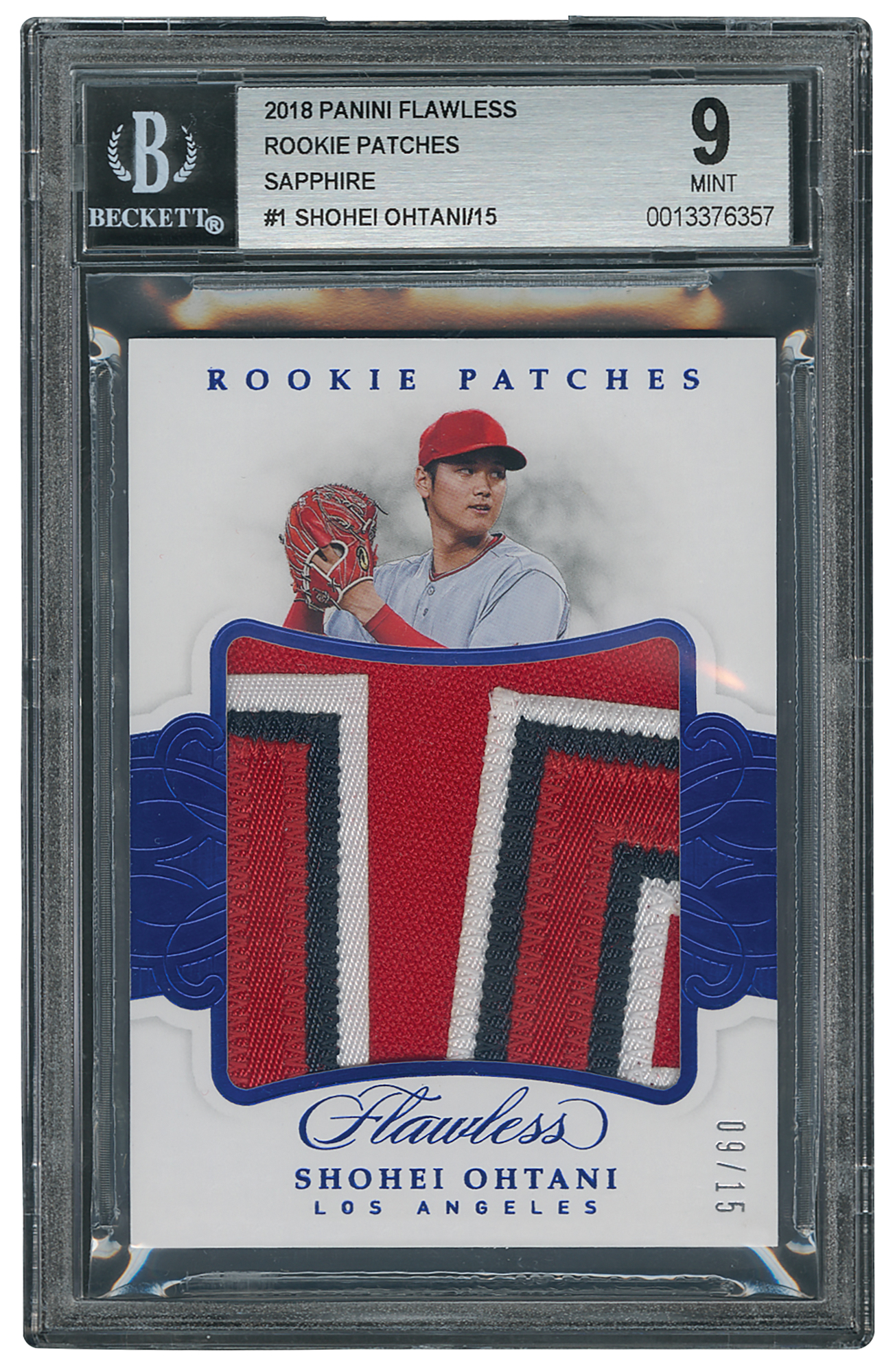 Graded by BGS MINT 9. Fantastic 'rookie patches' player-used relic card of Los Angeles Angels phenom Shohei Ohtani, numbered 9/15, featuring a large three-color, multi-segment patch on red uniform material. A fabulous, colorful card of the multi-talented superstar.