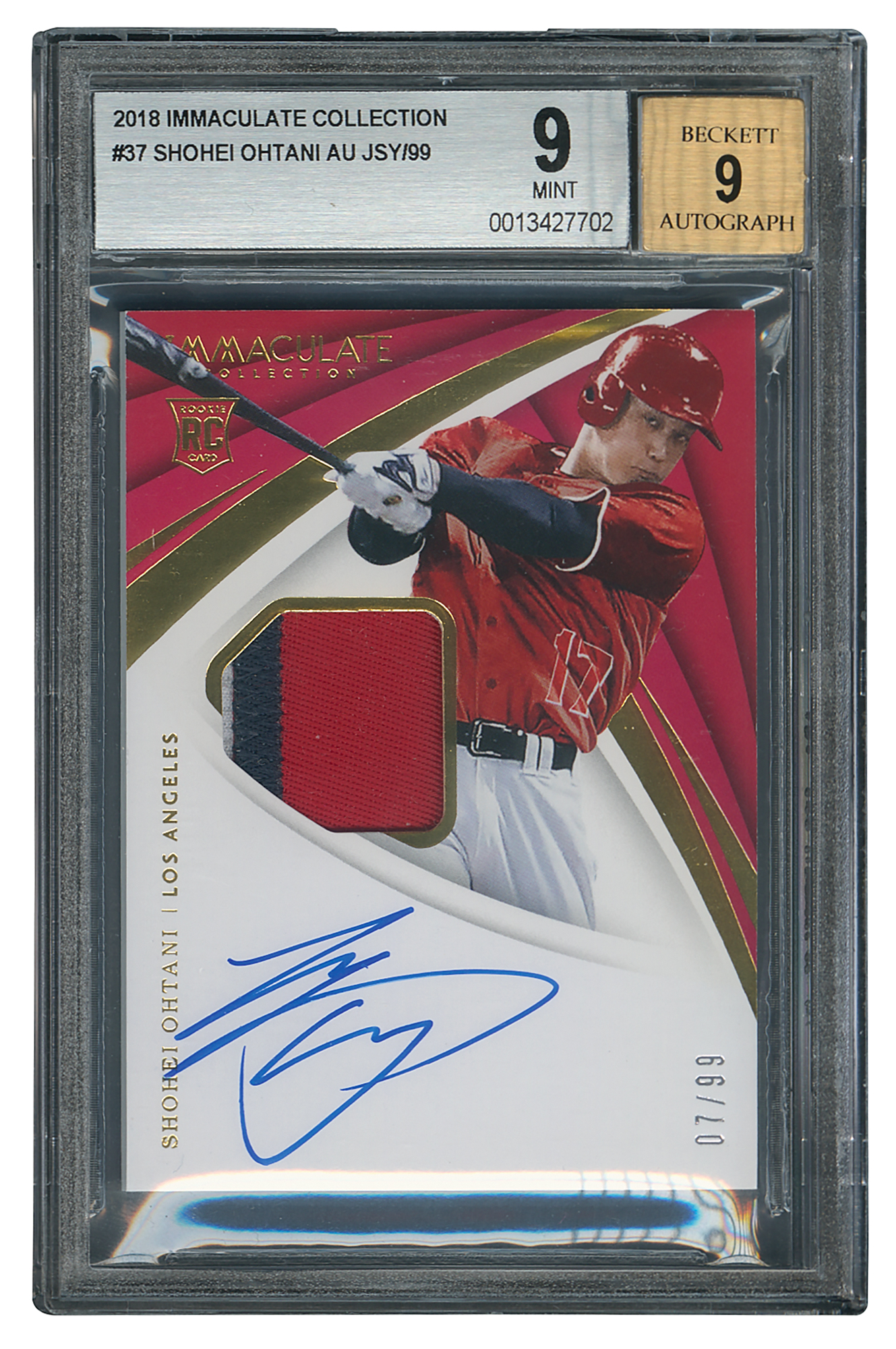 Graded by BGS MINT 9, with an autograph grade of 9. Stunning autographed player-used patch card of Los Angeles Angels superstar Shohei Ohtani, numbered 7/99, featuring a fine signature and excellent three-color patch swatch. A superior signed patch relic card of the baseball's most skilled star, who took home Rookie of the Year honors in 2018.