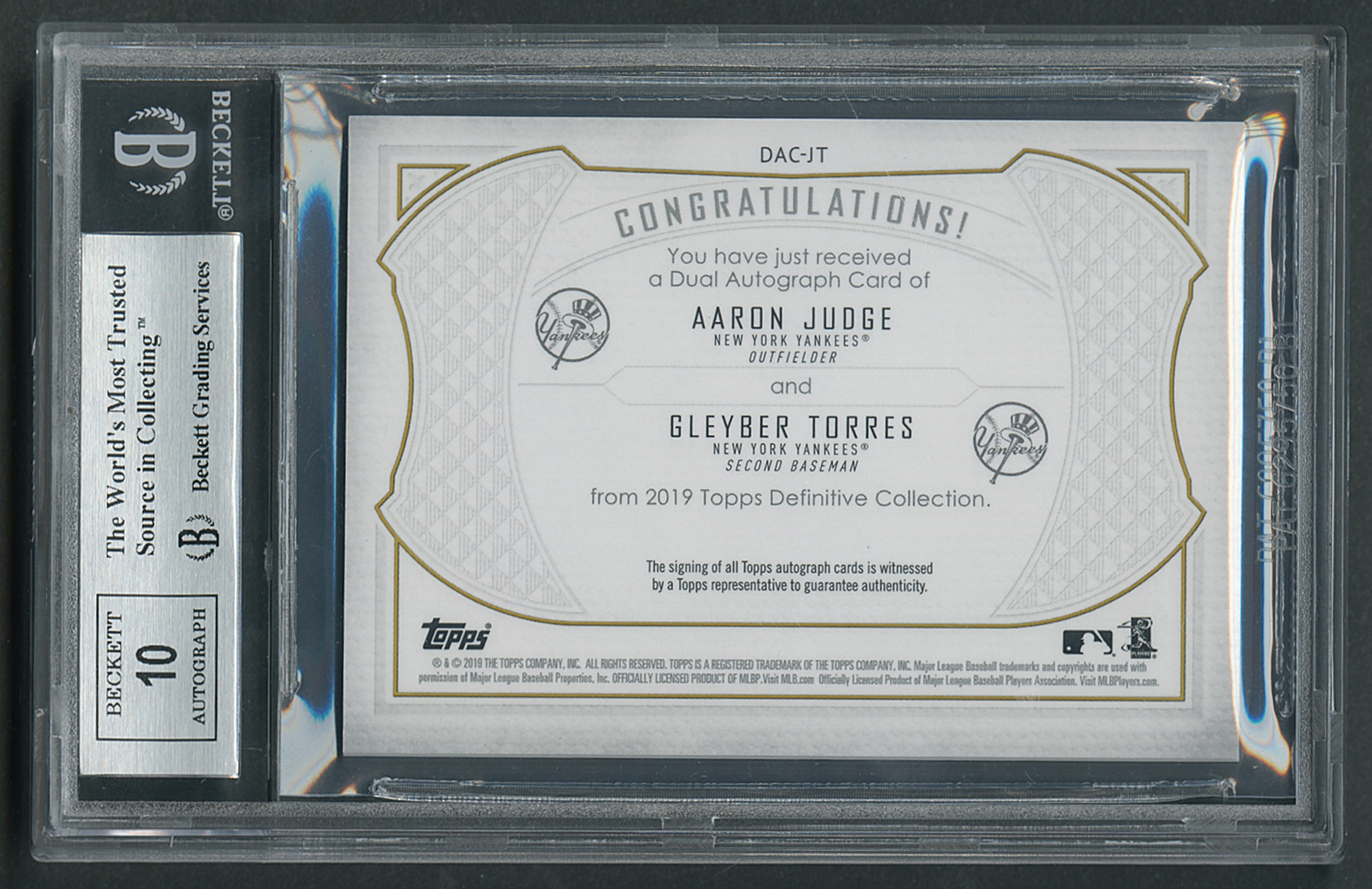 Graded by BGS MINT 9, with an autograph grade of 10. Great dual autograph card of young New York Yankees stars Aaron Judge and Gleyber Torres, numbered 3/5, gorgeously signed by both in bold blue felt tip.