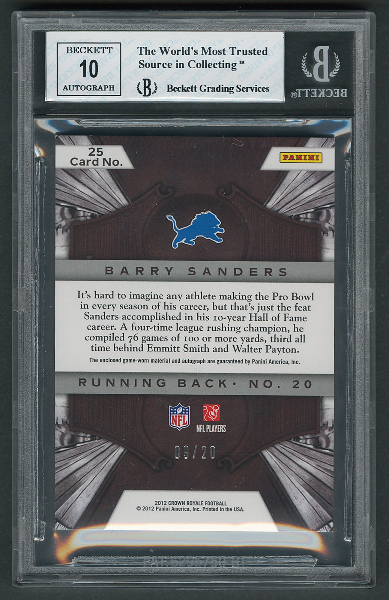 Graded by BGS NM-MT 8, with an autograph grade of 10. Coveted autographed relic card of renowned Detroit Lions running back Barry Sanders, numbered 9/20, featuring a fine blue felt tip signature and a desirable light blue game-used uniform swatch.