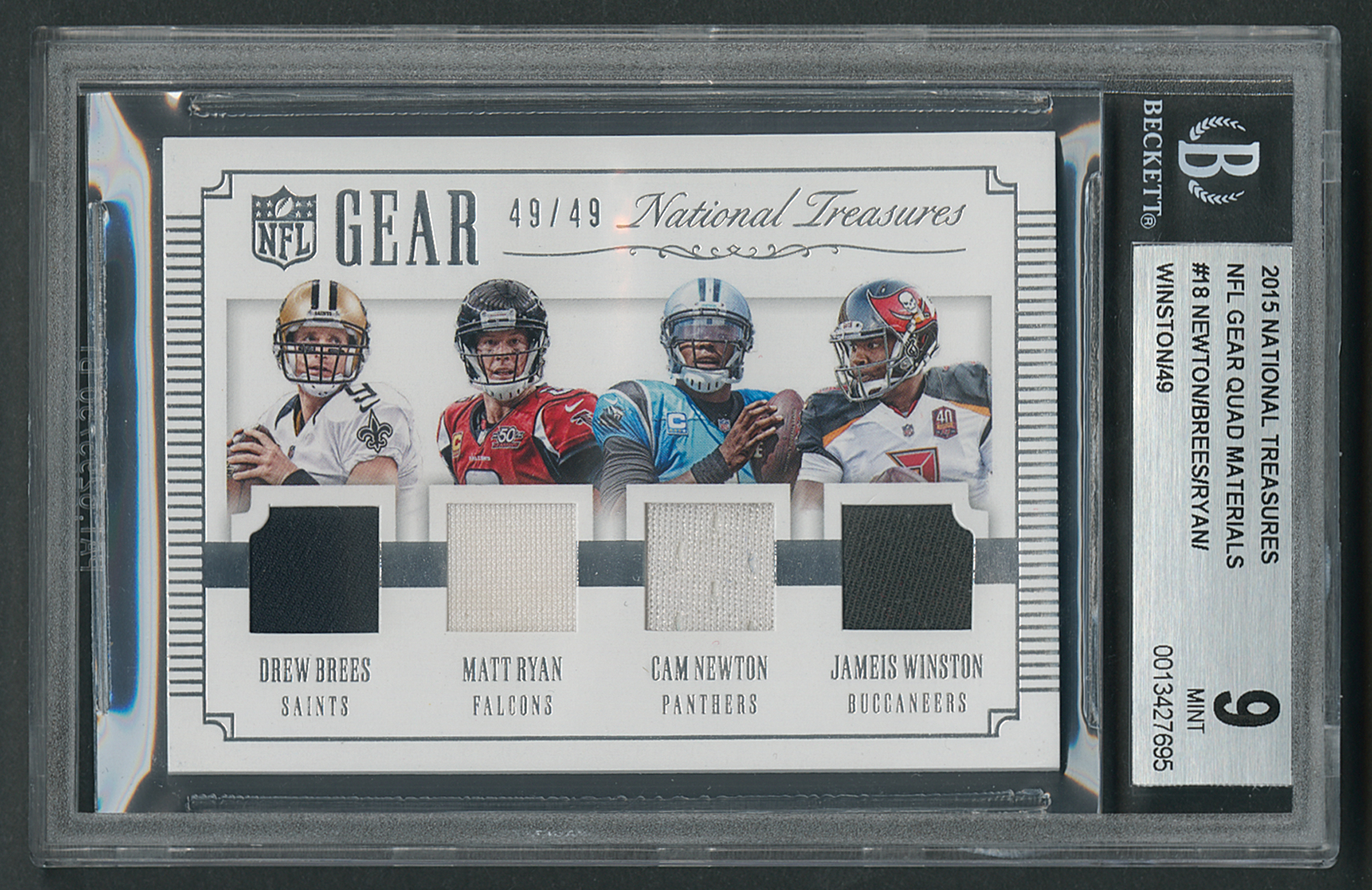 Graded by BGS MINT 9. Superb quad player-worn relic card of quarterbacks Drew Brees, Matt Ryan, Cam Newton, and Jameis Winston, numbered 49/49, featuring one-color patch swatches from each player. A fantastic card portraying the star signal-callers of the NFC South.