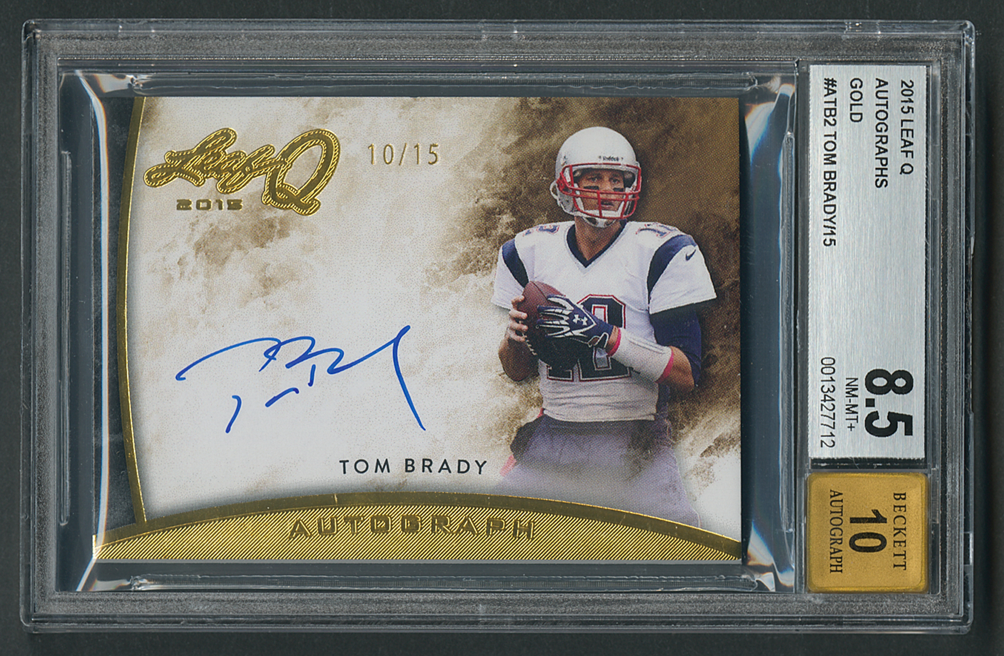 Graded by BGS NM-MT+ 8.5, with an autograph grade of 10. Superior autographed card of famed New England Patriots quarterback Tom Brady, numbered 10/15, featuring a perfect blue felt tip signature of football's greatest QB.