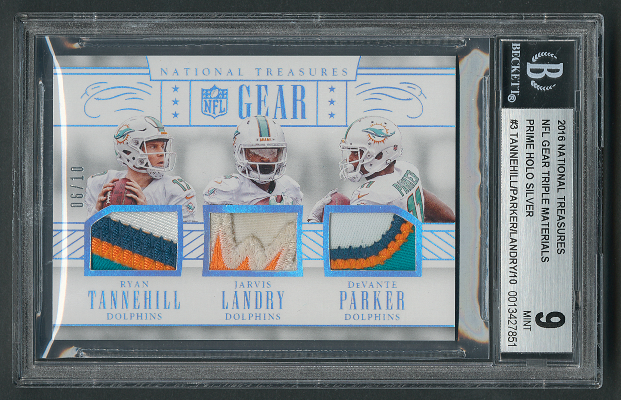 Graded by BGS MINT 9. Exemplary triple game-used patch relic card of Miami Dolphins stars Ryan Tannehill, Jarvis Landry, and DeVante Parker, numbered 6/10, featuring fantastic multi-colored patch swatches from each player. A great, colorful card from a high-flying Dolphins offense.