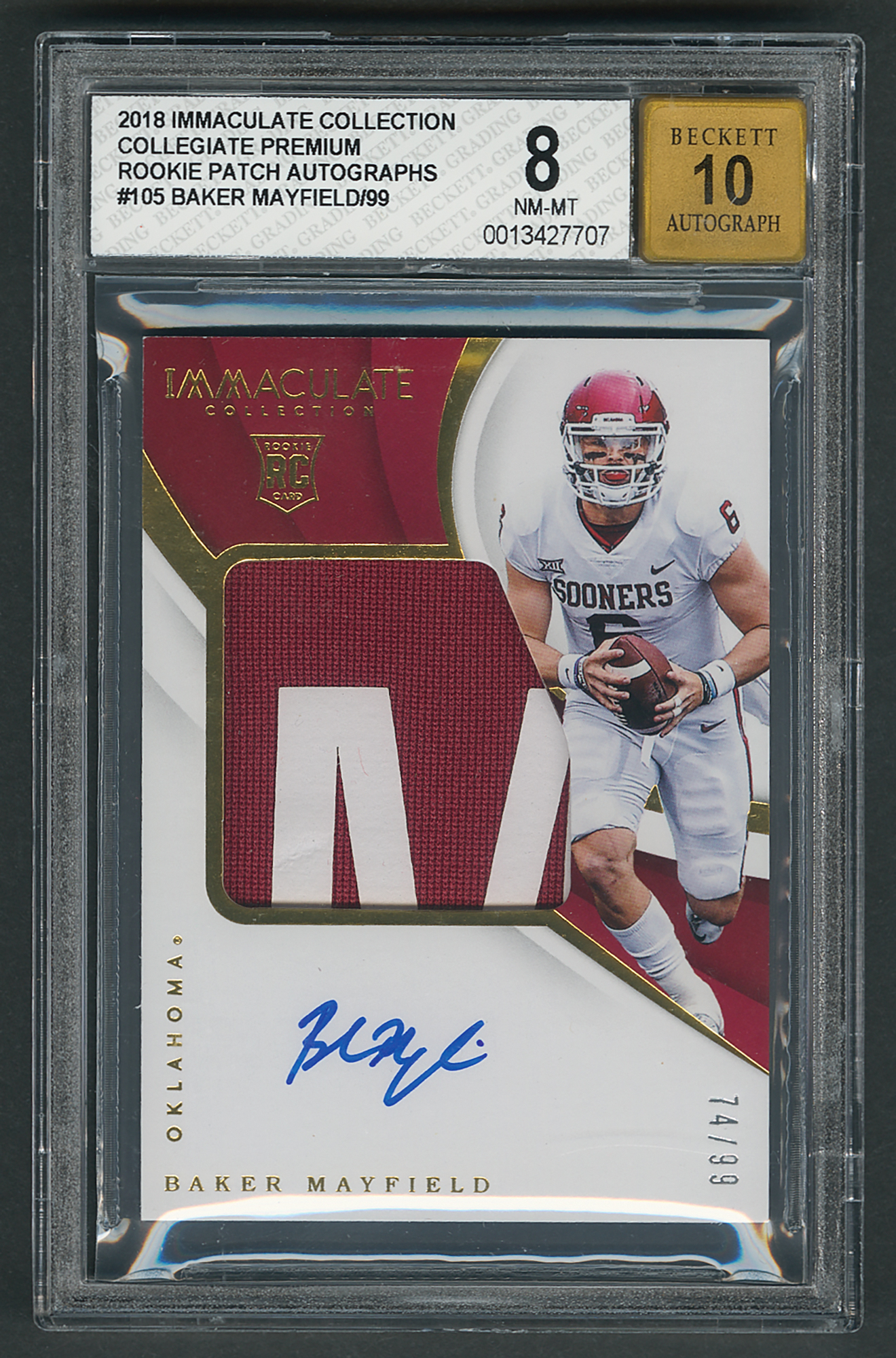 Graded by BGS NM-MT 8, with an autograph grade of 10. Excellent autographed player-worn patch card of Oklahoma Sooners star QB Baker Mayfield, numbered 74/99, featuring an ideal blue felt tip signature and nice letter-patch swatch. An outstanding signed relic card of the Heisman Trophy winner.