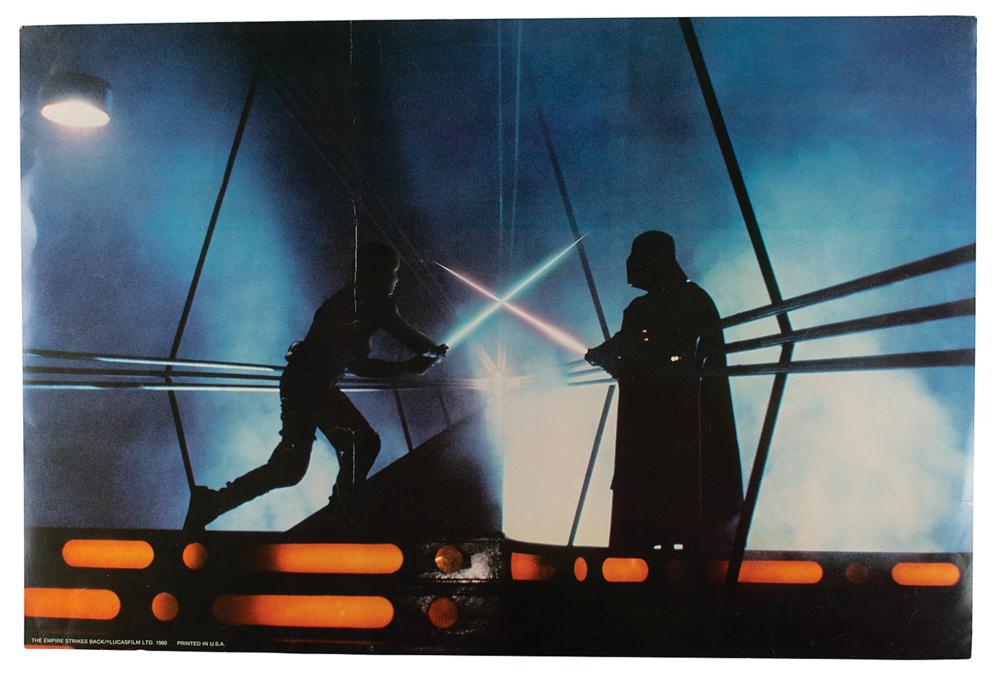 Appealing color 30 x 20 cardstock poster for the 1980 epic space opera The Empire Strikes Back, which shows a still image from the film's final lightsaber duel between Luke Skywalker and Darth Vader. The lower left corner features copyright and caption text: "The Empire Strikes Back / Lucasfilm Ltd. 1980, Printed in U.S.A." In very good condition, with overall creasing, and a heavier vertical crease.