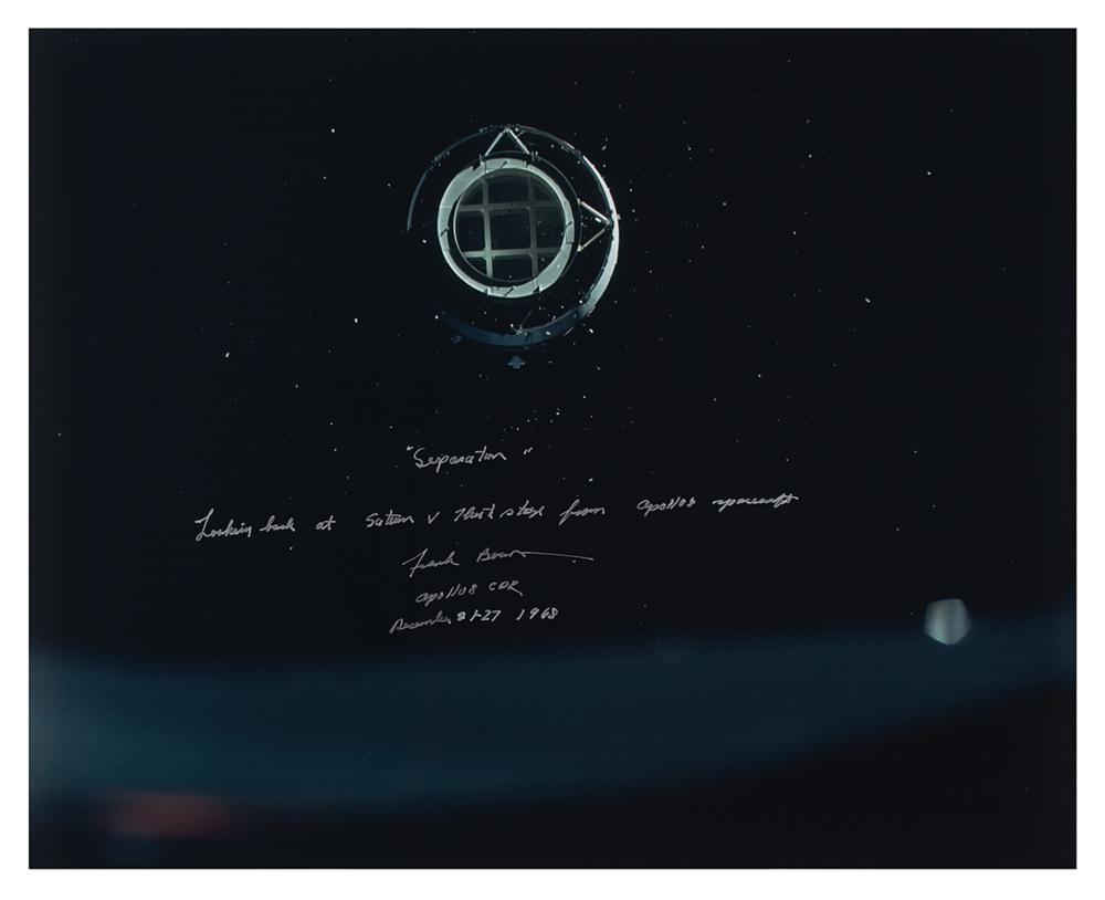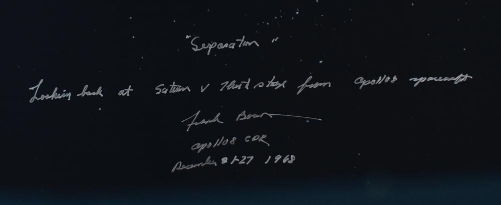 Uncommon color glossy 20 x 16 photo showing the jettisoned third stage of a Saturn V SA-503 rocket, the launch vehicle that carried the Apollo 8 astronauts into space, signed in silver ink, "'Separation,' Looking back at Saturn V third stage from Apollo 8 spacecraft, Frank Borman, Apollo 8 CDR, December 21-27, 1968." In fine condition.
