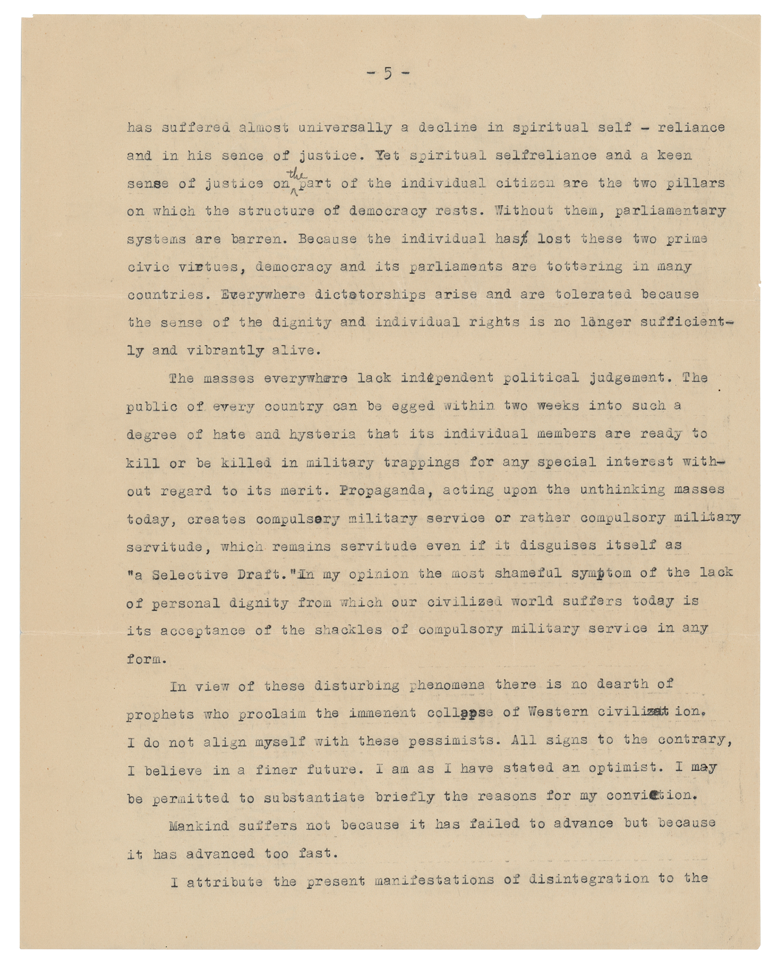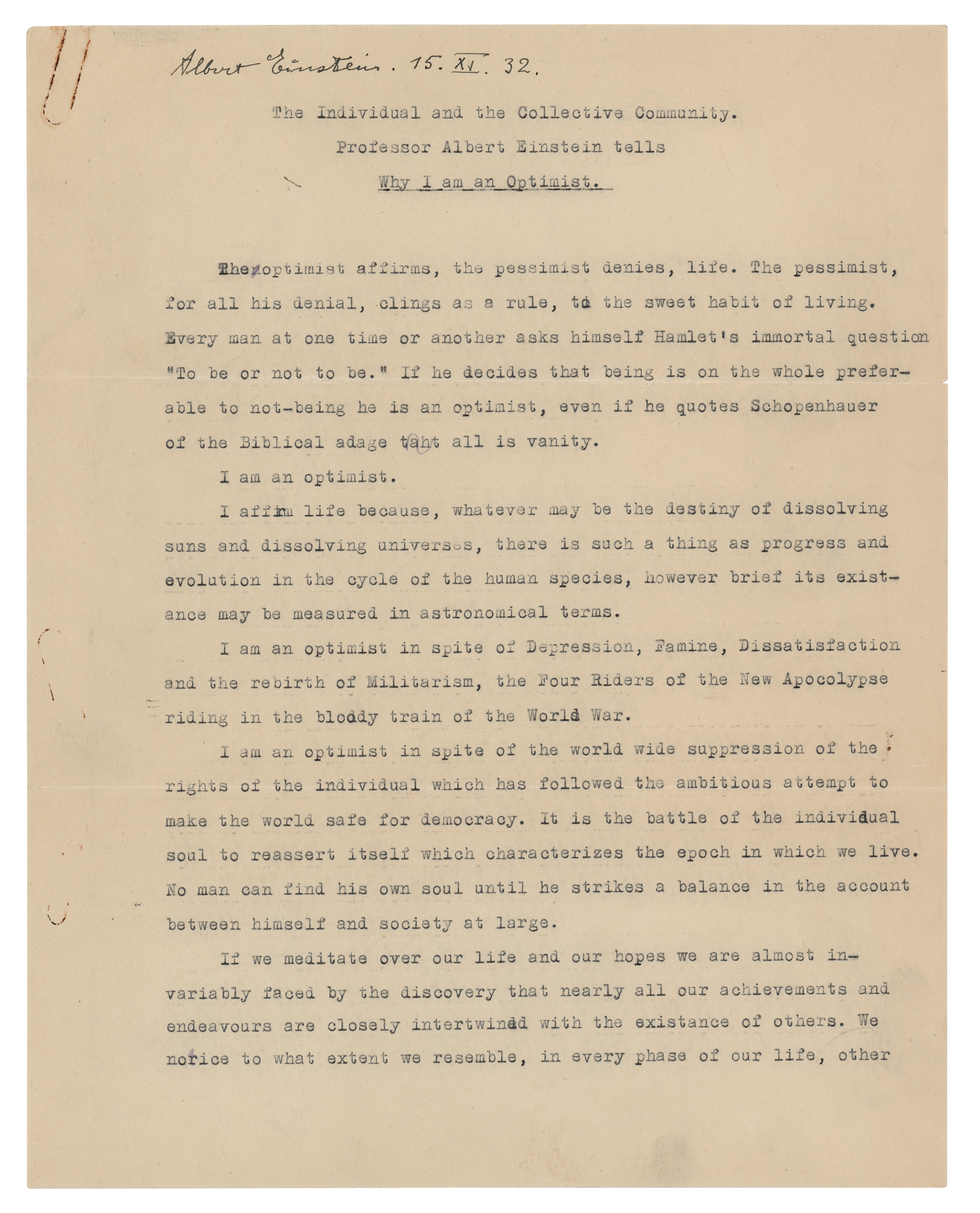 Typed draft of an article entitled “The Individual and the Collective Community. Professor Albert Einstein tells Why I am an Optimist,” signed at the top of the first page in black ink, “Albert Einstein. 15. XI. 32,” six pages, 8.75 x 11.25. The content of this manuscript was later published as the article, ‘Why Civilization Will Not Crash,’ which was featured in the August 12, 1933 issue of Liberty Magazine.