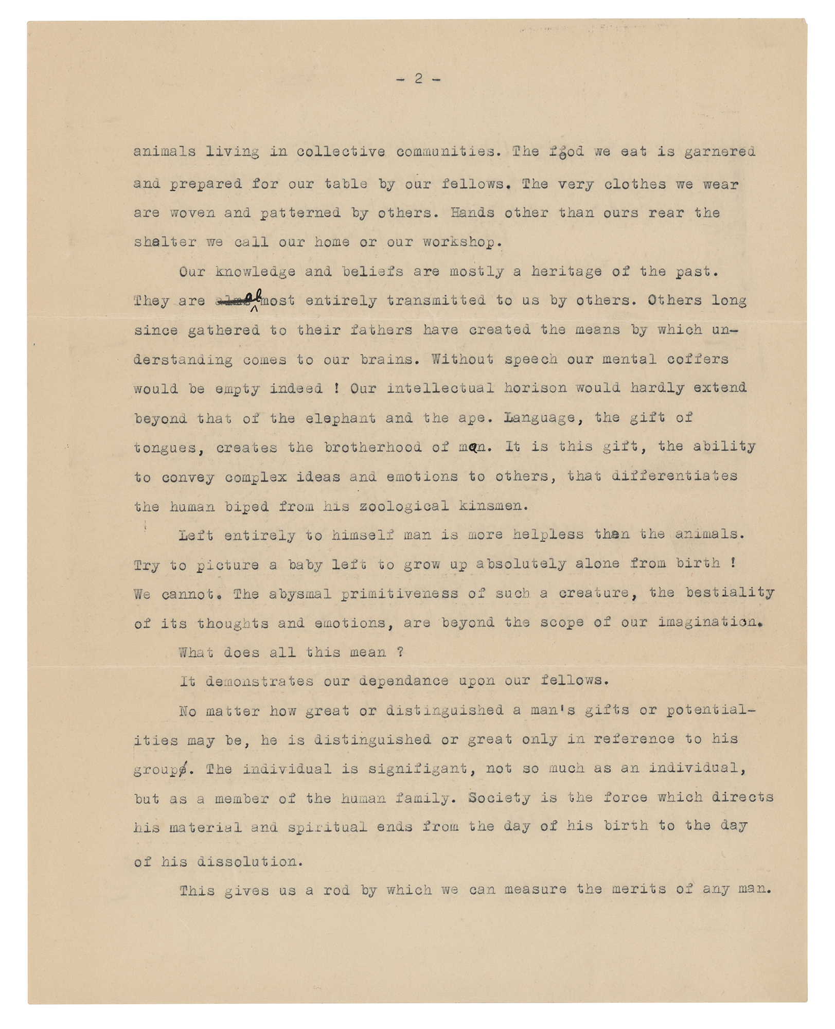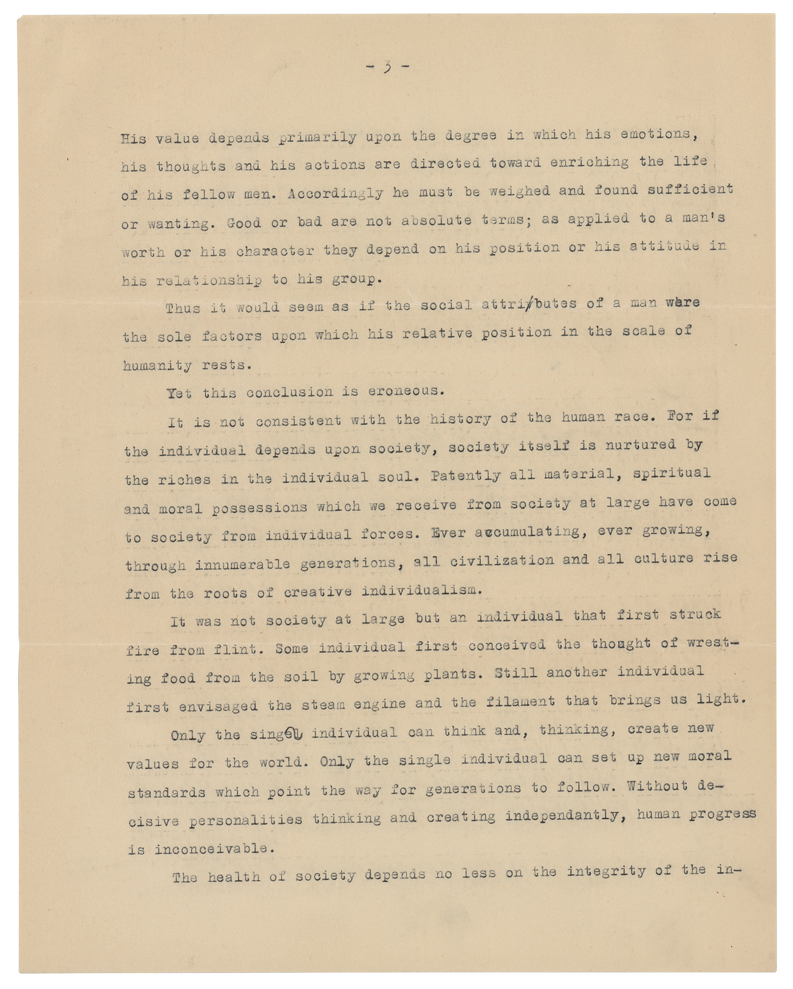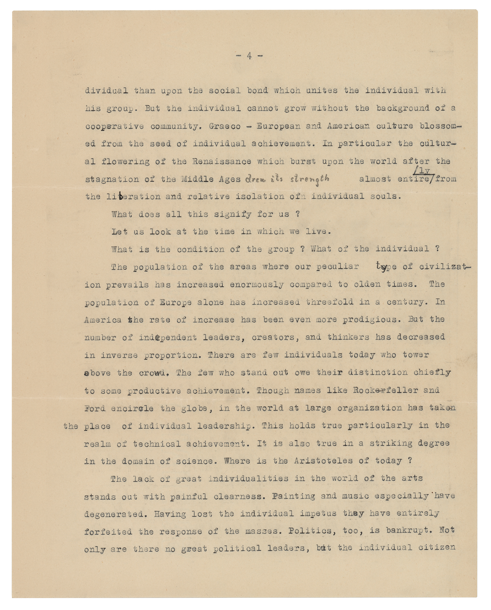 In this important article, Einstein presents a detailed sociological outlook while further confirming that his intellectual abilities extended well beyond scientific borders. Across six pages Professor Einstein stresses the importance of both society and the individual, and the inability of either to function alone. He laments the demise of individualism and the dearth of ‘great’ individuals, whether it be in politics or the arts. Einstein conveys deep concern by the ease in which the masses can be manipulated into serving special, often dictatorial, interests; and he provides evidence of his pacifist tendencies, describing “the most shameful symptom of the lack of personal dignity from which our civilized world suffers today is its acceptance of the shackles of compulsory military service in any form.” The text, which bears some corrections in an editorial hand, in full: