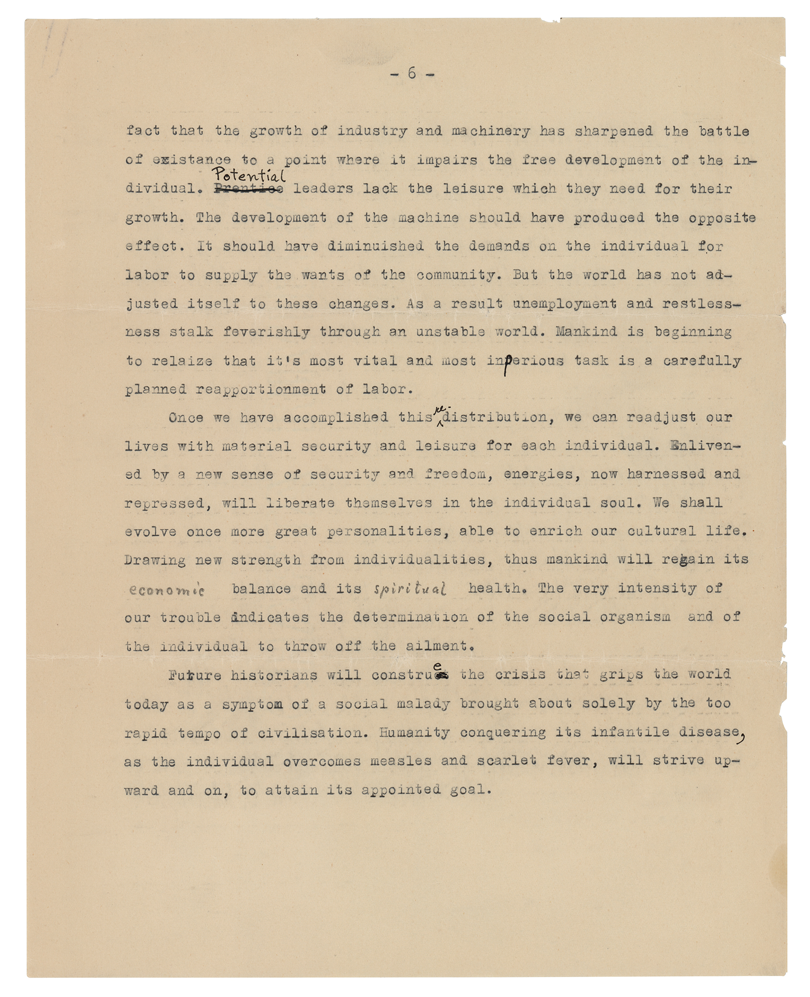 I attribute the present manifestations of disintegration to the fact that the growth of industry and machinery has sharpened the battle of existence to a point where it impairs the free development of the individual. Potential leaders lack the leisure which they need for their growth. The development of the machine should have produced the opposite effect. It should have diminished the demands of the individual for labor to supply the wants of the community. But the world has not adjusted itself to these changes. As a result unemployment and restlessness stalk feverishly through an unstable world. Mankind is beginning to realize that its most vital and most imperious task is a carefully planned reapportionment of labor.