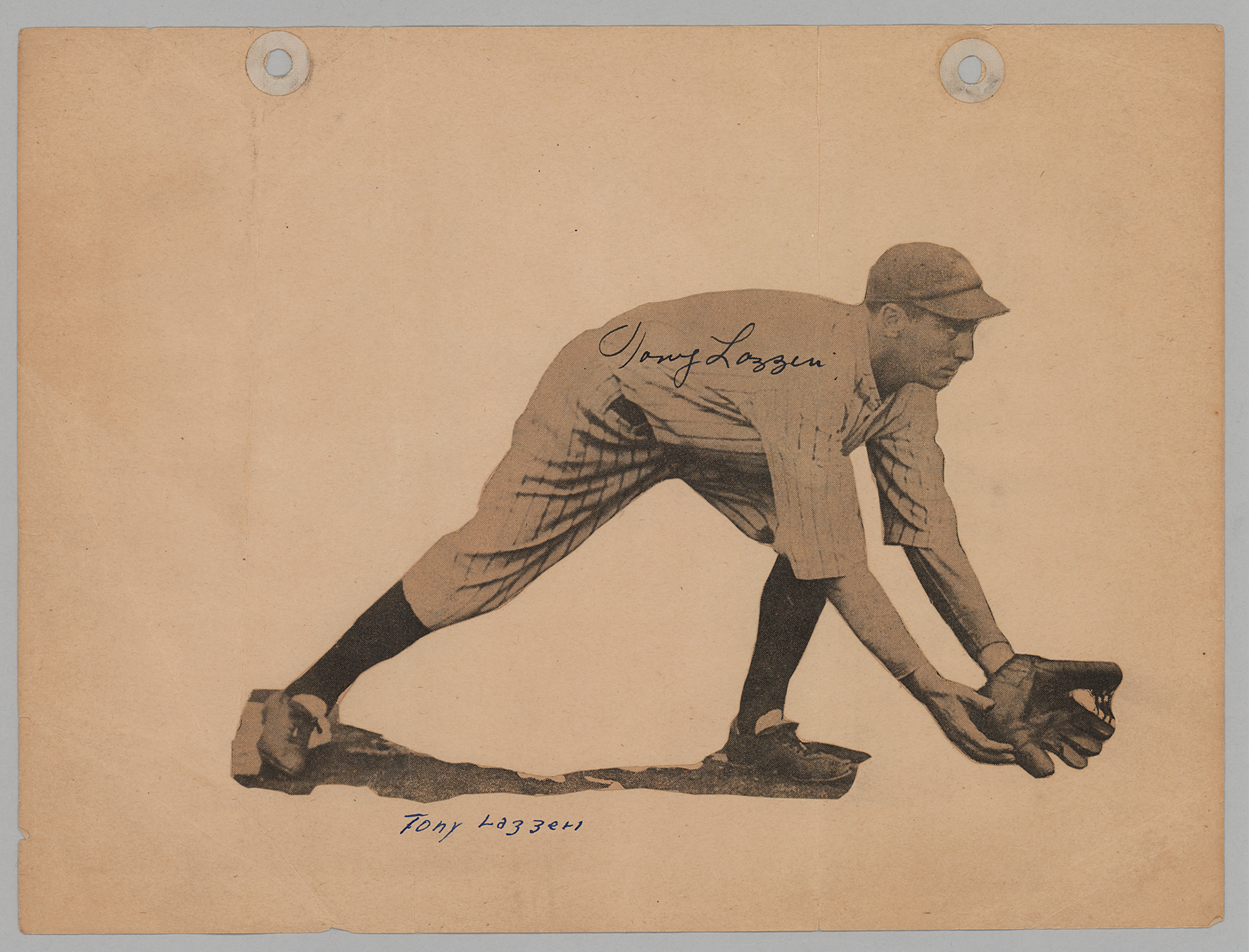 Photo of Tony Lazzeri clipped neatly from a newspaper, depicting the Hall of Fame second baseman preparing to scoop up a ground ball, signed across his back in black ink. The clipping is affixed to an off-white 10.5 x 8 sheet, which is in turn attached to a cardstock mount. In very good to fine condition, with folds, creases, and two reinforced file holes to the top edge.