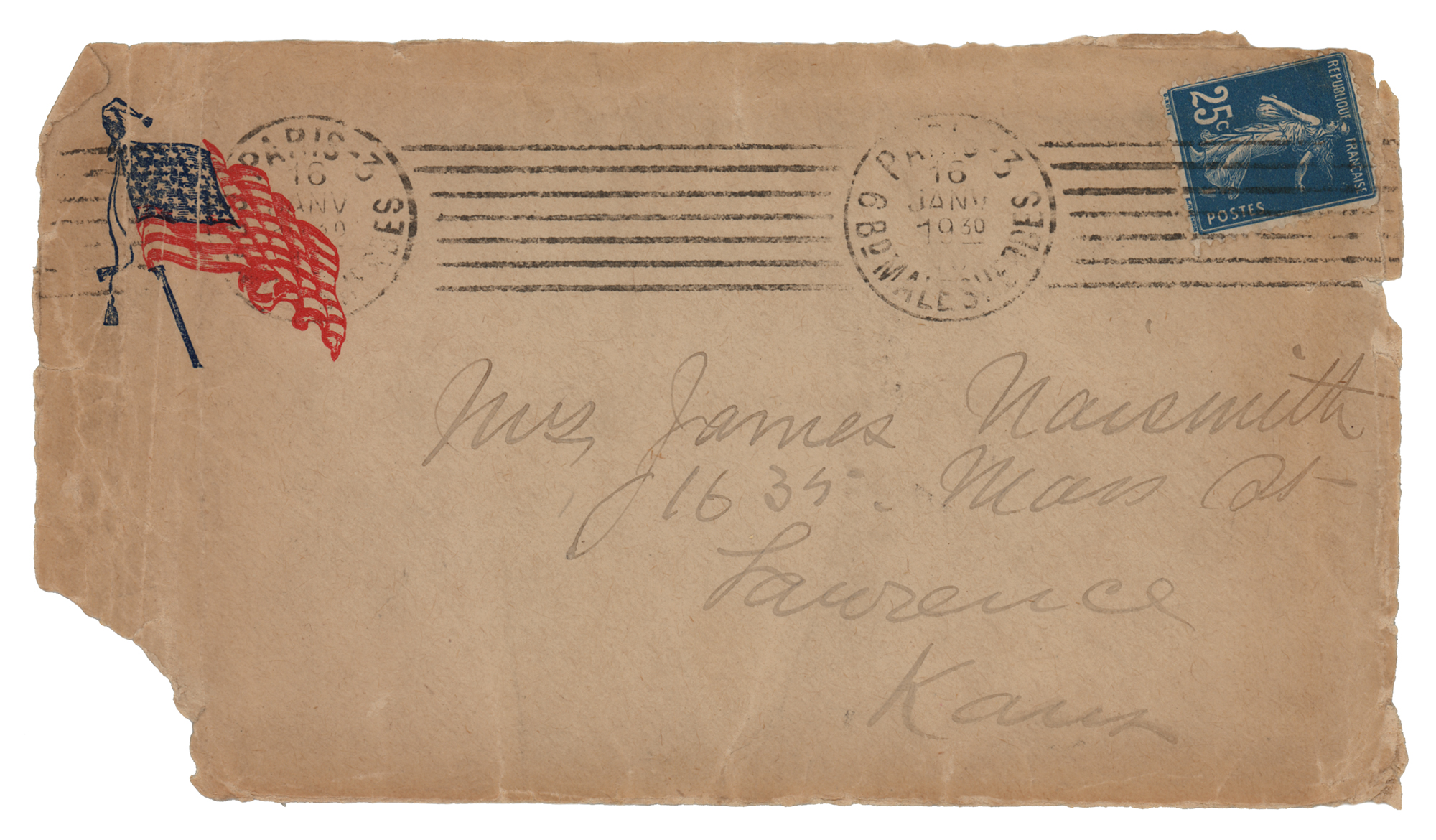 Front panel to a mailing envelope, 6.5 x 3.75, addressed in the hand of Dr. James Naismith to his wife, “Mrs. James Naismith, 1635 Mass St., Lawrence, Kansas,” postmarked in Paris on January 16, 1930. In very good to fine condition, with light creasing and soiling, and loss to the lower left corner.