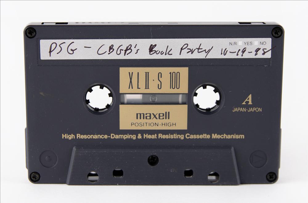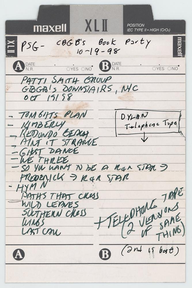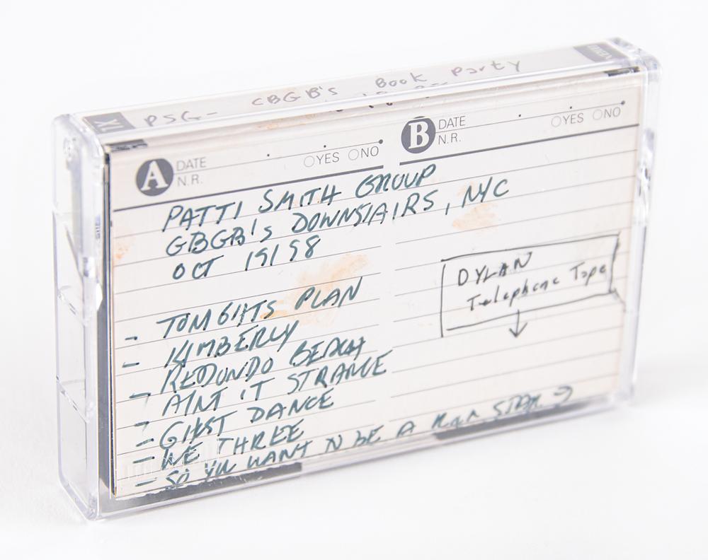 The roughly nine-minute recording is actually found twice on the B-side of the cassette tape, with the A-side and the start of the B-side containing a bootlegged recording of the Patti Smith Group live at CBGB in New York City on October 19, 1998. The Dylan recordings can be heard back-to-back, with the second version of slightly better quality. Includes the original tape holder with J-card annotated in black ink by Glover, who writes: “+Telephone Tape, (2 version of the same thing) (2nd is best).” This recording is credited as item No. 490 on the 1963 web page run by Bob Dylan historian Olof Björner. In fine condition.