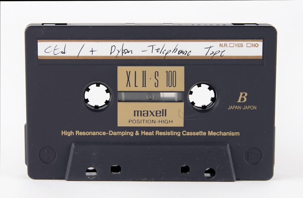 A Maxell XLII cassette tape containing nearly nine minutes (8:49) of a recorded phone call of Bob Dylan from circa May-June 1963. The recording was originally made by his friend, Minneapolis musician and journalist Tony ‘Little Sun’ Glover, who held a microphone to the receiver of a telephone and captured snippets of six songs played and sung by Dylan—‘Ballad of Hollis Brown,’ ‘Girl from the North Country,’ ‘Boots of Spanish Leather,’ ‘Eternal Circle,’ ‘Hero Blues,’ and early working stanzas for ‘Tomorrow Is a Long Time.’ The recording, which is found on the tape’s B-side, essentially works as a ‘mix tape,’ given that it’s composed of different phone calls from Dylan, who mentions, at the start of the recording, that he might make a few calls that day to Glover. In addition to the five tunes, which hears Dylan singing and playing the guitar and harmonica, the recording also features the famed troubadour laughing, offering light banter, and talking about his girlfriend, all of which is done in a relaxed and creative manner.
